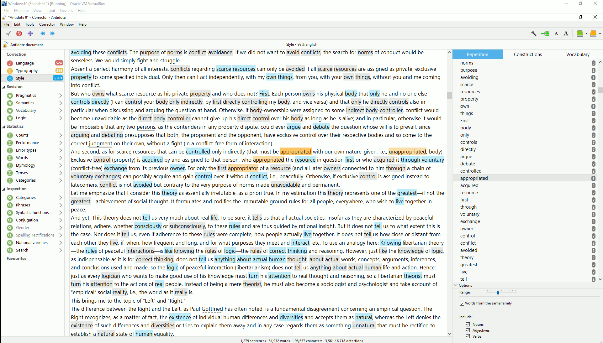 On a similar note, the "Inconsistencies" was very good and also took into account root words + hyphenation (so it would catch "honor" + "honoured" + "semi-honourably"). Because Antidote also breaks each word into parts of speech, it was able to catch some typos I otherwise never would've been able to find: A few capital words in the middle of a sentence (turns out PDF had speck of dust in the upper right of 'h' turning it into 'H'): Quote: