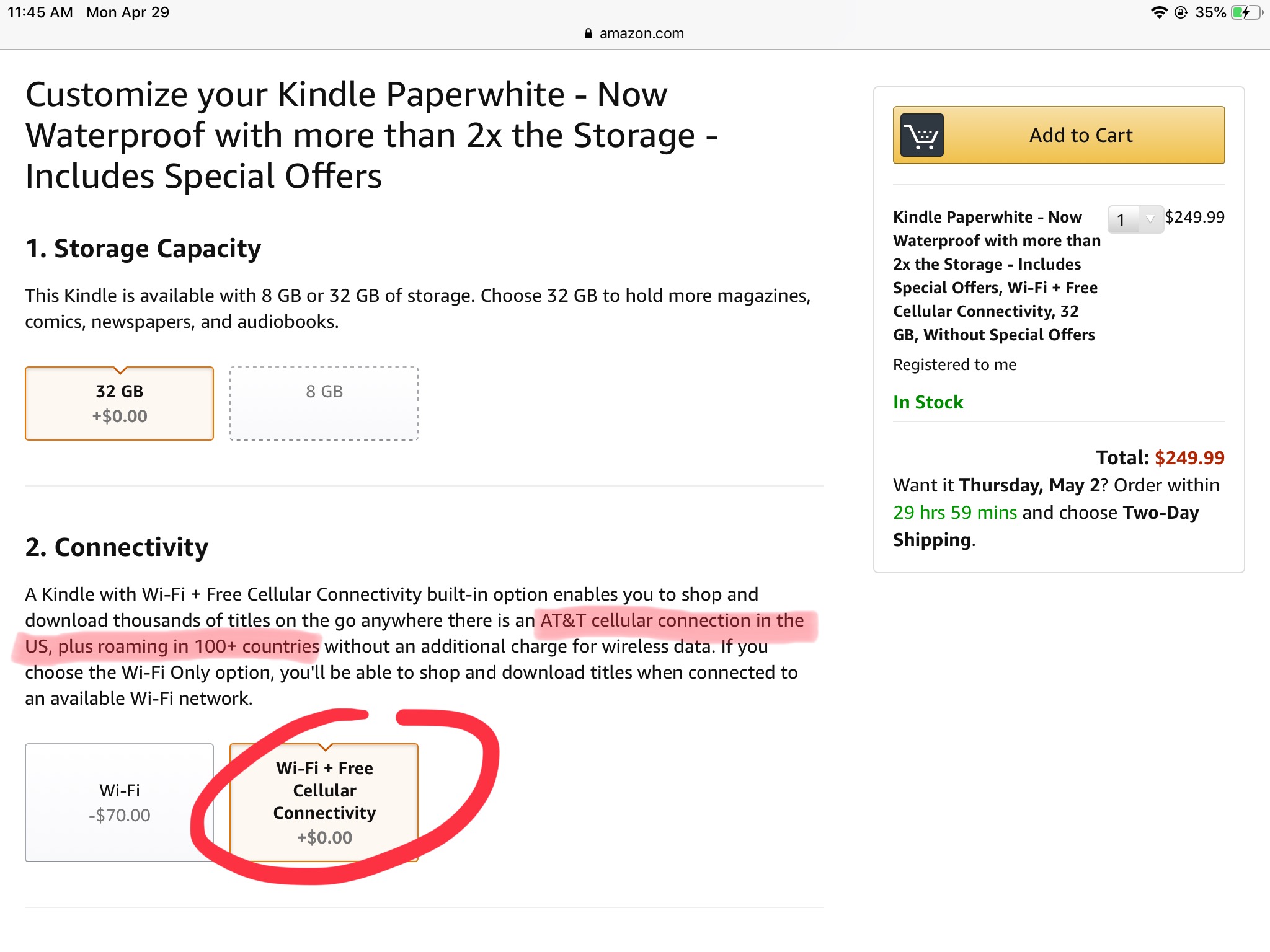 Kindle Paperwhite – Now Waterproof with more than 2x the Storage, Free 4G LTE + Wi-Fi It's also on the customize page. The brand new Voyage and Paperwhite on Woot are overstock of Int'l 3G so cellular won't work in US. However, it's incorrect to say the newest Kindles don't have cellular options. Last edited by ilovejedd; 04-29-2019 at 03:54 PM. |