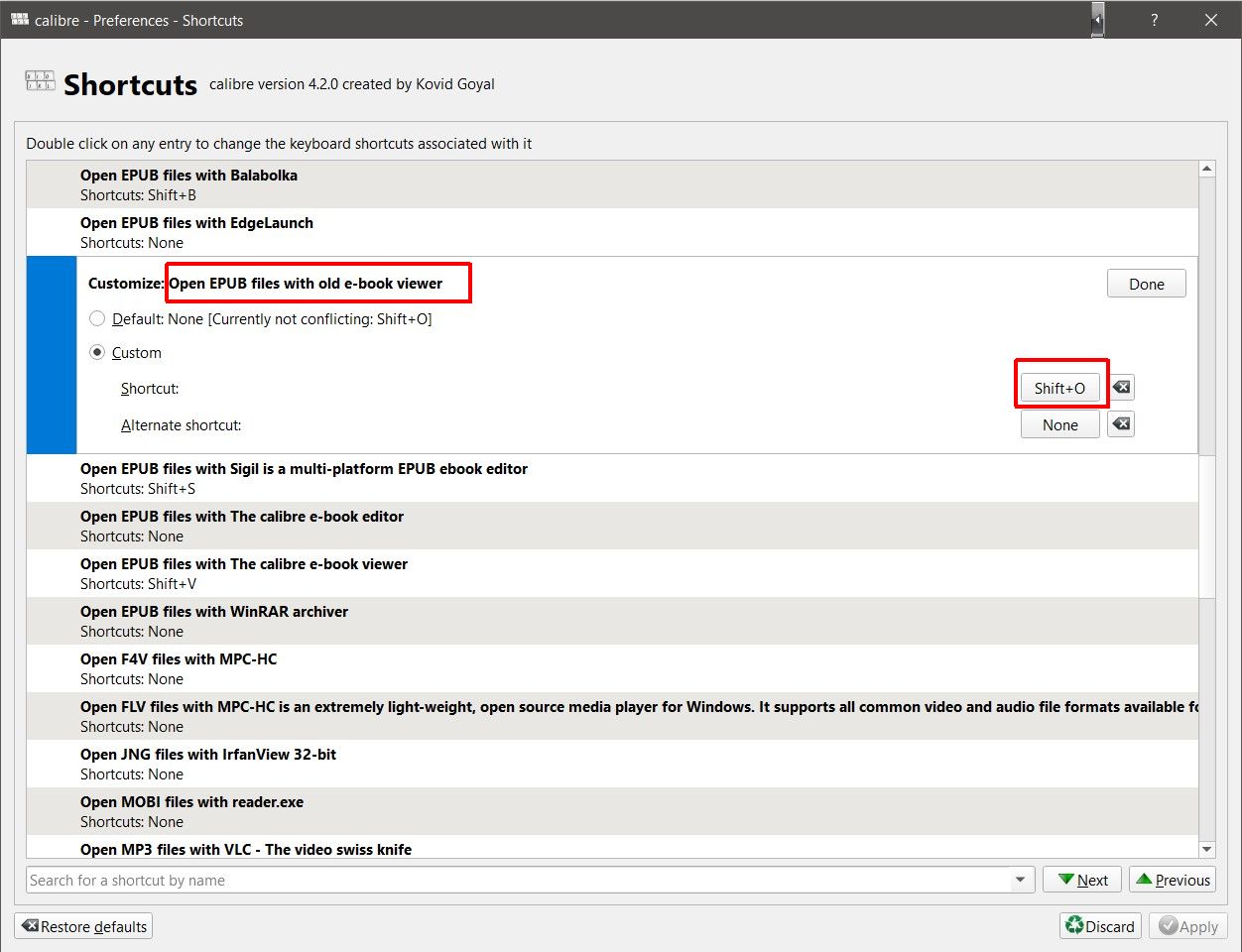 * items reflect my hatred of ambiguity, not strictly necessary. Installed 3.48 portable at D:\_Sandpit\Calibre Portable *Copied ebook-viewer.exe to oldviewer_original.exe for safety *Renamed ebook-viewer.exe to oldviewer.exe *Used Resource Hacker to change oldviewer.exe's icon (blue book) Then from calibre 4.n went into View Specific Format(Alt+V/Cmd+V) Selected Add another application for EPUB files, which popped Clicked Browse computer for program, browsed to D:\_Sandpit\Calibre Portable and selected oldviewer.exe *Closed calibre, and edited Config windows_open_with.json to change name Restarted calibre and gave it a keyboard shortcut And ended up with * items reflect my hatred of ambiguity, not strictly necessary. I don't use the viewer for other formats, only epub BR Last edited by BetterRed; 10-23-2019 at 06:32 AM. Reason: updated screen shots |