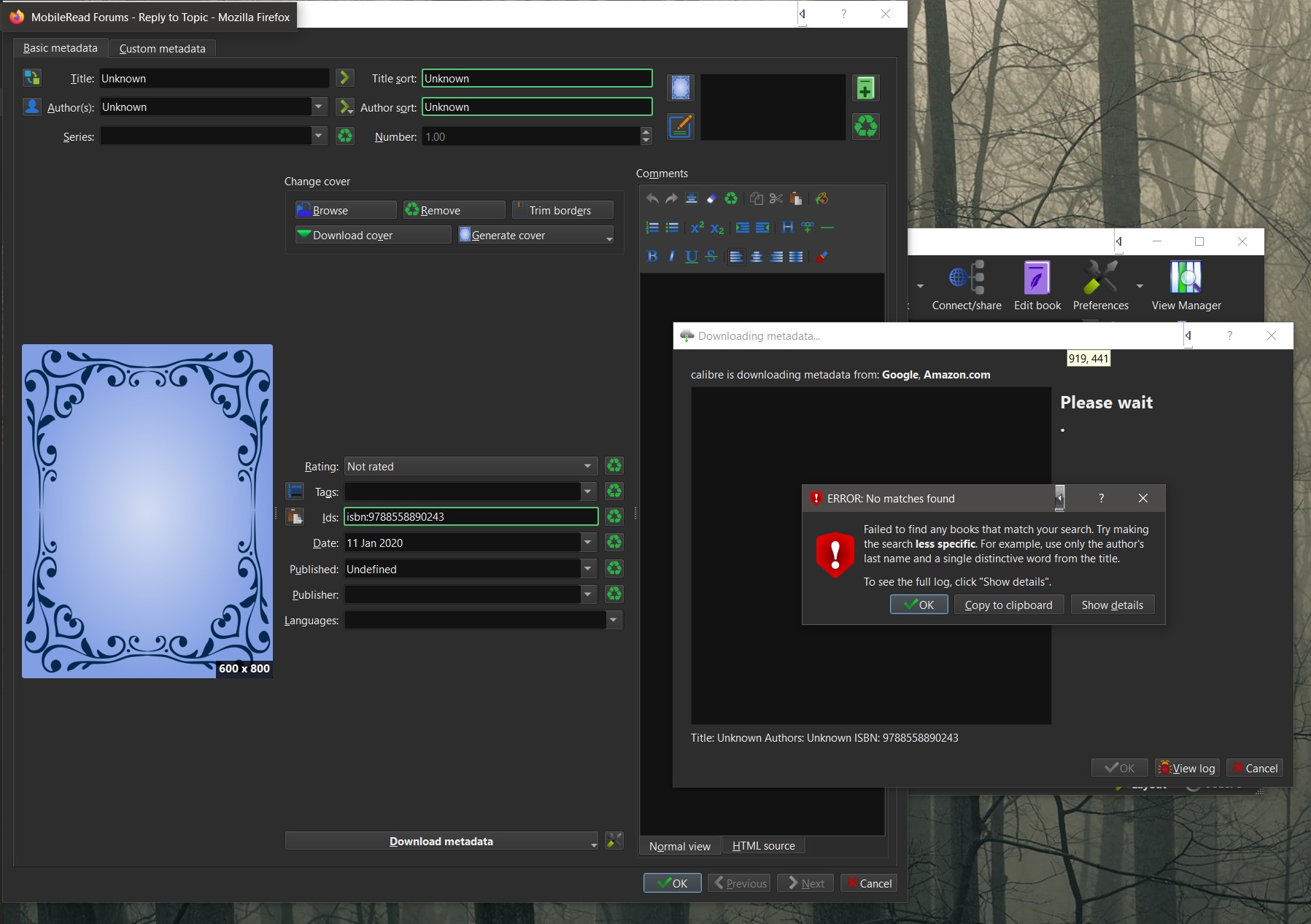 calibre, version 4.8.0 ERROR: Download failed: Failed to download metadata or cover for the selected book. Unknown (Failed metadata) (Failed cover) One only gets a View Log button if something is found, I had to salvage this from ...\Temp\calibre_yohscz Spoiler: