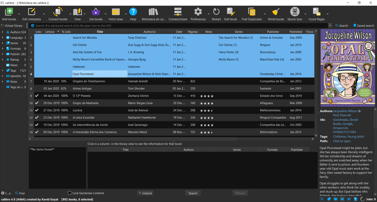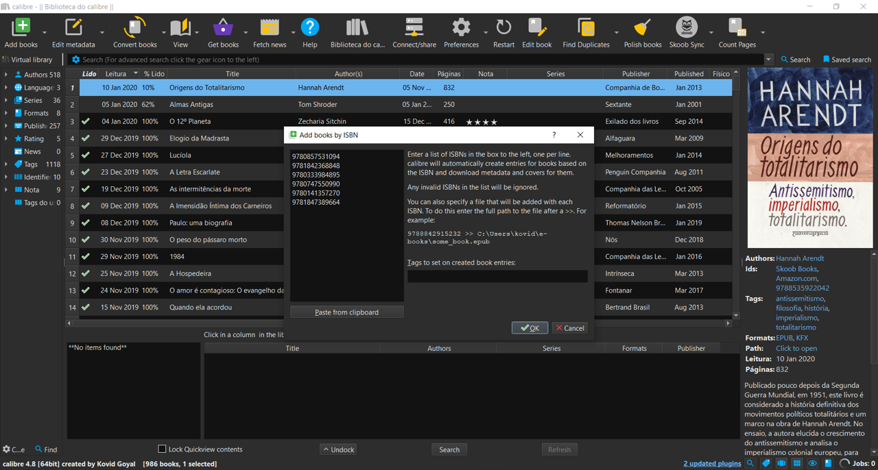 On my first post I typed the WRONG ISBN (it was on my clipboard because I was testing another title in portuguese). This is the list of ISBNs posted by the OP: 9780857531094 9781842368848 9780333984895 9780747550990 9780141357270 9781847389664 Now, adding these books from ISBN (using all metadata sources here), worked fined. Only one was not found (9781842368848). See the attached images. |