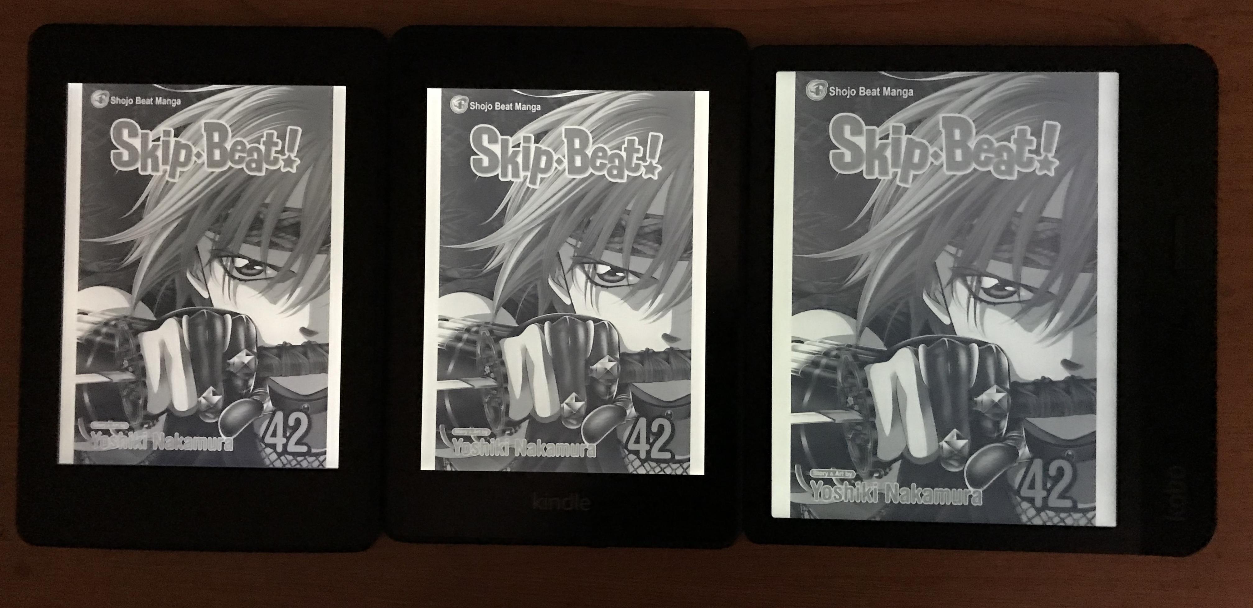 Tried an AZW3 file (and lossless extracted images as CBZ for Libra). Using native reader, brightness set to 0 (off for PW4 and Libra, very dim light on PW3). Scanner did a much better job than taking pics with my smartphone. Alas, no RAW mode I know of so this uses 300dpi, JPEG compression followed by JPEG lossless crop.I think the dim light on the PW3 made it look more washed out compared to the others. The PW3 has better contrast than either PW4 or Libra albeit in this particular example, the PW4 is really close. I find myself preferring the image processing techniques Amazon uses versus Kobo. Makes comics easier to read. From left-to-right: PW3, PW4, Libra H2O Last edited by ilovejedd; 02-04-2020 at 11:31 AM. |
