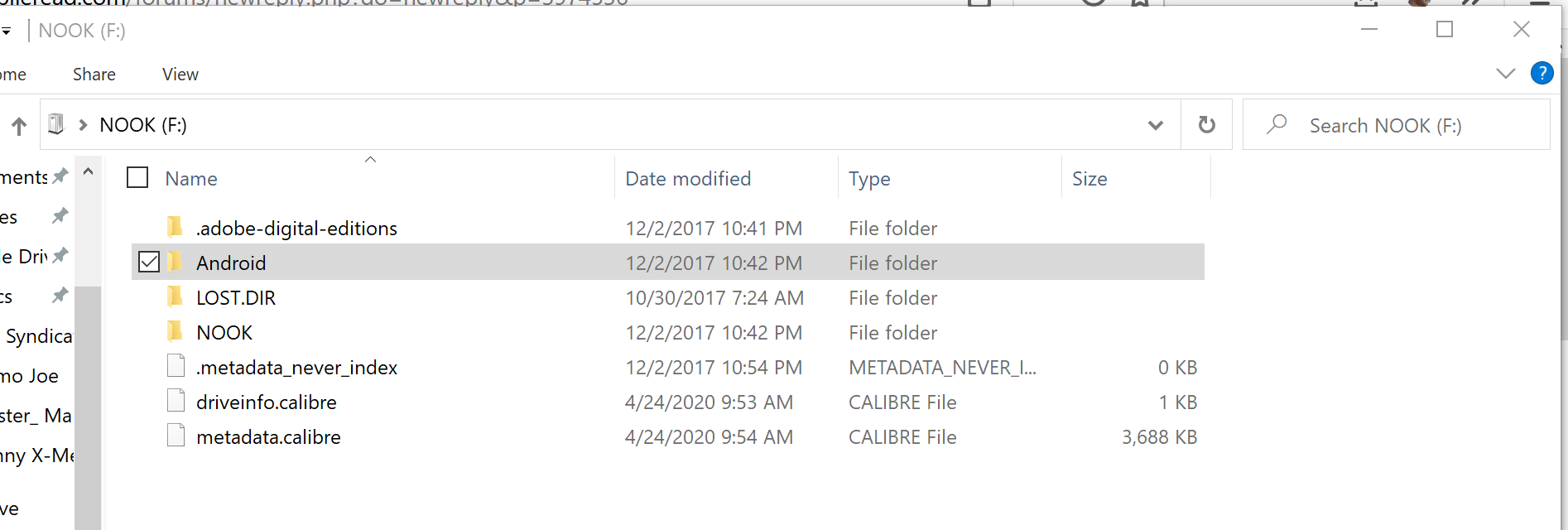I was reluctant to delete folders, although I would try it with an older device. I exchanged it for a new one today. All the folders in the new Nook are proper, and just like what I see in my other Nooks. At one time I wondered if Calibre did something to corrupt the Nook folders, but I just added 60 ebooks via Calibre and all is fine. I am not technically savvy about this stuff, but I wonder how the bad Nook managed to work just fine. I wouldn't have known there was trouble except that I tried to put pictures into a particular folder that wasn't there. Thanks to all again. And maybe new Nook owners should check it as a USB drive and see what the folders look like.