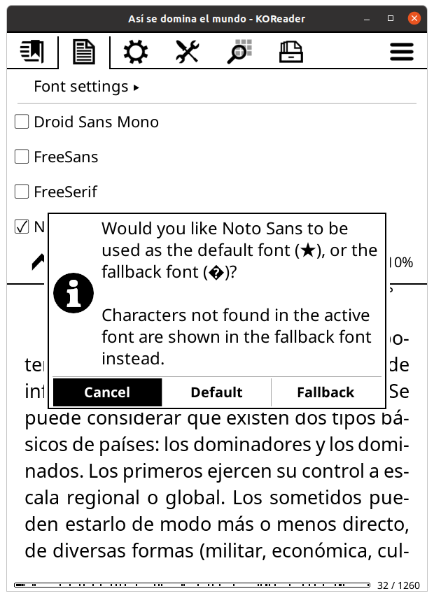 On touch devices, when you long press a font you can select it as default/fallback font to use it on all the documents (see attachment). If you click on default that would be propagated to settings.reader.lua as well. On NT devices you might need to add the setting manually, like on previous posts, but with contents: Code: