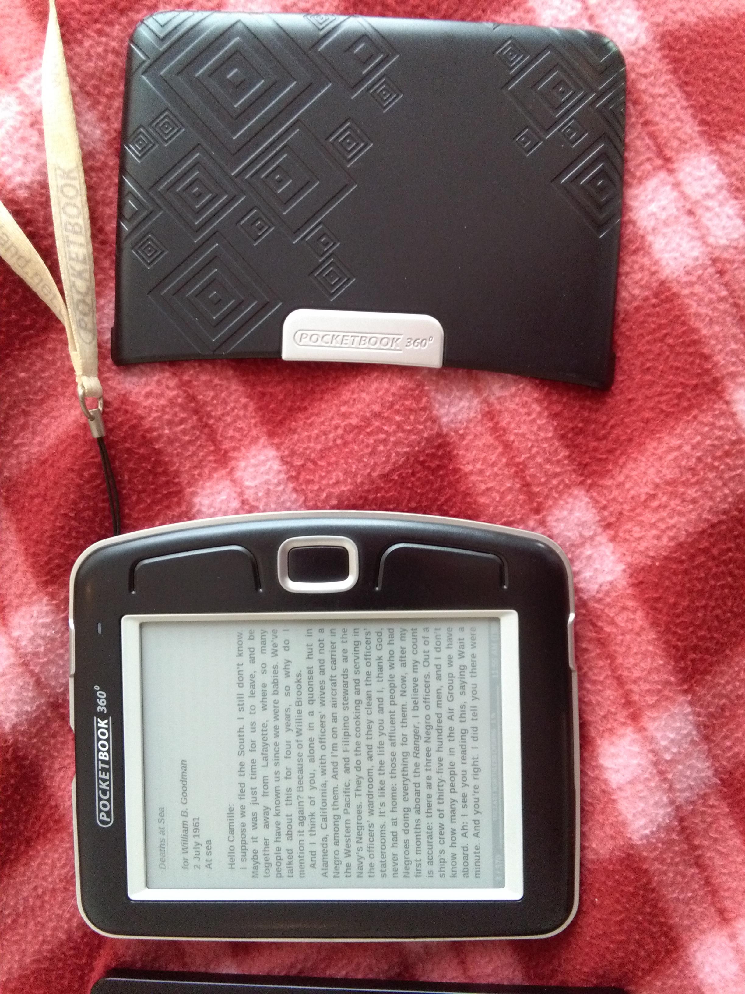One photo shows the PocketBook 360 next to my current partner: A Kobo Glo HD - and it doesn't snore, gurgle, burp, or pass wind in the night! Jon: Notice that I have it protected in a cover. I might throw the ebook reader under the car to see if it survives.