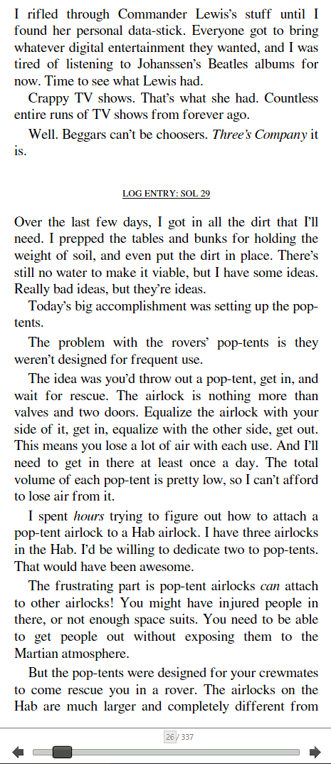 The simple gap+noindent also causes issues when the new scene starts at the very top of a page. You'll assume it's a continued/split paragraph from the previous screen. I think the one I read all those years ago was Andy Weir's The Martian. I just checked, and they mix Chapters > Daily Logs > gap+noindent / 3 centered bullets •••: Image 1 is the previous page. Image 2, you can see the gap+noindent landing on the very top of the screen. No reasonable person would notice this. You would continue reading, then wonder why there was just a drastic change in scene/tone, become confused, MAYBE click back... and/or just continue reading. Image 3 shows centered bullets in a later chapter. Overall, not the best ebook decisions, and probably just replicated the Print formatting... Nobody is reading the book at Image 1 and thinking: "Oh, that final word ends before hitting the right margin... the paragraph on next screen might start with no indent!" Side Note: Also, another potential reason against gap+noindent is users may read with (*shudders just thinking about it*) left aligned or "block paragraphs". Quote: