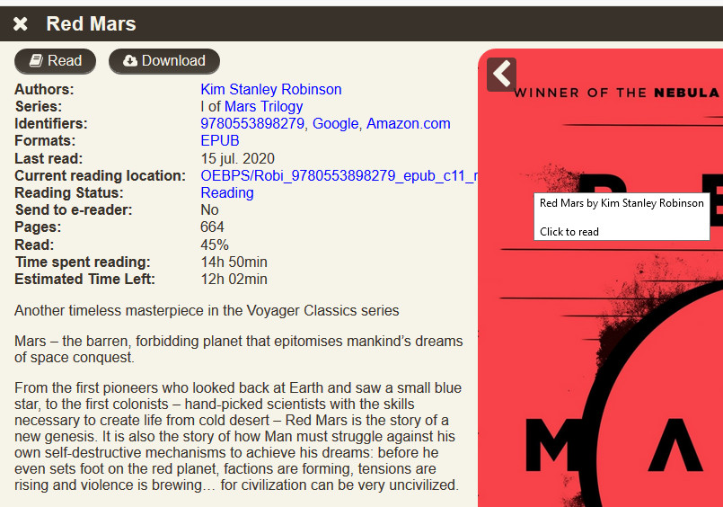 Though for some reason my content table is really small, it has only the data for the last 30 days or so. Maybe I did something in the past that wiped it out. With the hard part out-of-the-way and after Quoth's minimalist post questioning why not simply use Calibre, I decided to do just that. In order to make all this work wirelessly, I use bash scripts that run in the Kobo device, which communicates through SSH to my little linux server that hosts Calibre. The scripts are called by using the excellent NickelMenu, so everything is well-integrated in the Kobo main menu. Next weekend I will try to implement some simple graphs, which will show how much was read in a specific week/month etc. These will have to be hosted outside Calibre of course. The docker suggestion was so that everyone could deploy locally, in a safe and easy way, a SSH server and some web server. But on second thought, I guess only the maniac people who are interested in stats will bother with this. A container is probably over complicating things for such small gains....