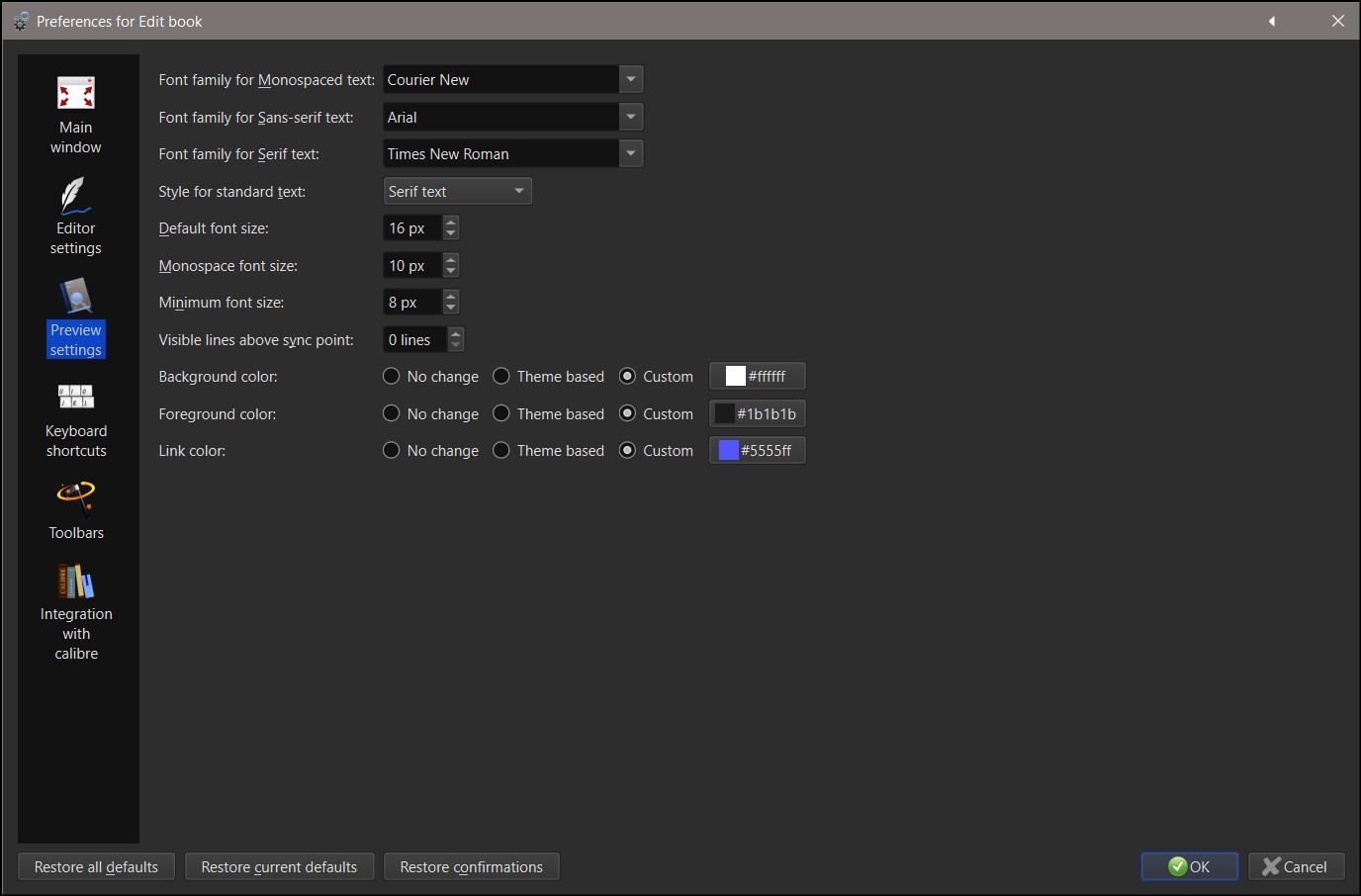 I've installed Calibre 4.23 and I want to give a big thank you to Kovd for the editor preview color option. It works very well.