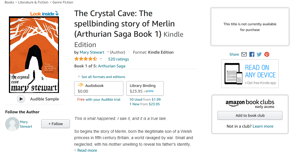 UK Amazon ebook. https://www.amazon.co.uk/Crystal-Cav.../dp/B00713DNEE USA Amazon ebook https://www.amazon.com/Crystal-Cave-.../dp/B00713DNEE I have two different paper editions, so I've never bought the ebooks. We have a lot of Mary Stewart books, but the wife won't read the Arthurian ones because they are Arthurian. Otherwise she's a fan. It's also suspicious that it's the ONLY Mary Stewart on Smashwords. I've not read the last two of the series of five. I assumed it was a trilogy. I'd be very surprised if it's not a pirate edition. |
