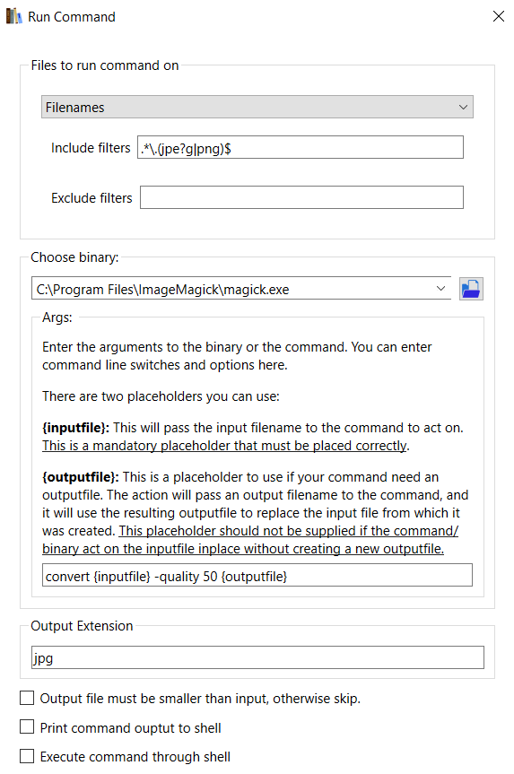 For me it will be very useful. But I have ImageMagick installed correctly (although my knowledge of its use is zero) on Windows 10. I have copied your screenshot as it is and the thing does not work. I'm guessing it has to do with {inputfile} and {outputfile}, and it would be great if you could tell me what to do. Thanks in advance. |