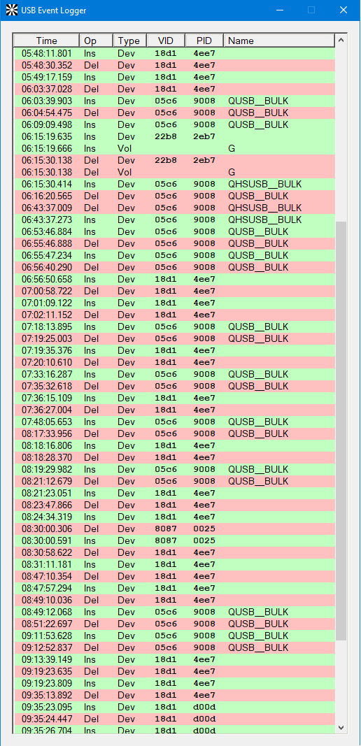 Interface Descriptor: bInterfaceNumber: 0x00 bAlternateSetting: 0x00 bNumEndpoints: 0x03 bInterfaceClass: 0xFF bInterfaceSubClass: 0xFF bInterfaceProtocol: 0x00 iInterface: 0x05 0x0409: "MTP" iSerialNumber: 0x03 0x0409: "16E91C12" bNumConfigurations: 0x01 VID: 18d1 (also 0000, 05c6) PID: 4ee2 (also 4ee7, 0004, 9008) Under "Name," there are multiple events from today, some of which have the following two IDs: Code: