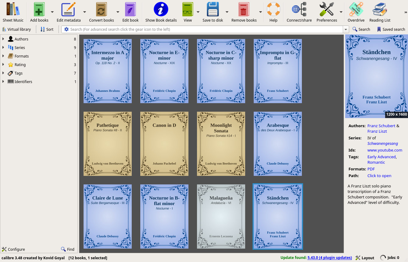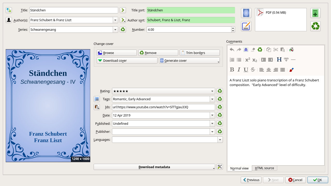 Kind of in the same vein as "alternate uses for Calibre" in tracking my wish list, I also use Calibre to track some of the piano sheet music I play. I keep a PDF copy of each piece, and a URL that links to a video (typically on YouTube) of someone performing the exact version of the piece that is in the PDF. It sometimes helps in the initial learning phase for a new piece to see the music ("View PDF in Browser" in Calibre-Web) while listening to it (Click on "URL" in Calibre-Web). The built-in webserver in Calibre may provide these same features, but I use the third-party Calibre-Web personally. I set the color of the Calibre-generated book cover based on the difficulty level of the piece (beige for easy, blue for moderate, gray for difficult).