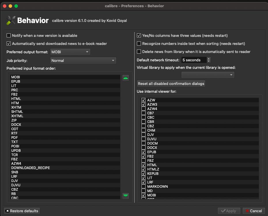 That being said, in looking at the settings in Preferences>Conversion>Common Options>Page Setup, I had my "input profile" set to "kindle". I tried changing that to "mobipocket books", restarted Calibre, and then tried the whole process on a newly added book again, but no luck. EPUB was still rejected by Amazon. And when I go into the Convert Individually dialogue, the input format still defaults to AZW3. I'm also not sure why you suggested "Restore Defaults", but that doesn't change anything. I think AZW3 is the "default" input format, even though I have MOBI above AZW3 in Preferences>Behavior>Preferred input format order. |