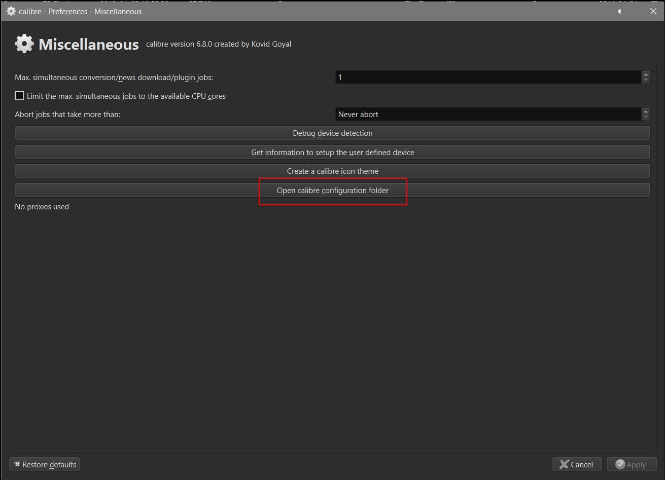 ![]() Just to confirm it's not a plugin, try restarting with no plugins, viz: Assuming that doesn't work: While calibre is NOT running, rename the calibre configuration folder, and then start calibre - this will create a fresh config folder. I'm not sure where that folder is on a Mac, but you can open in Preferences->Miscellaneous, viz: If the problem remains, you can remove the fresh config folder and reverse the renaming of the one you had. BR |