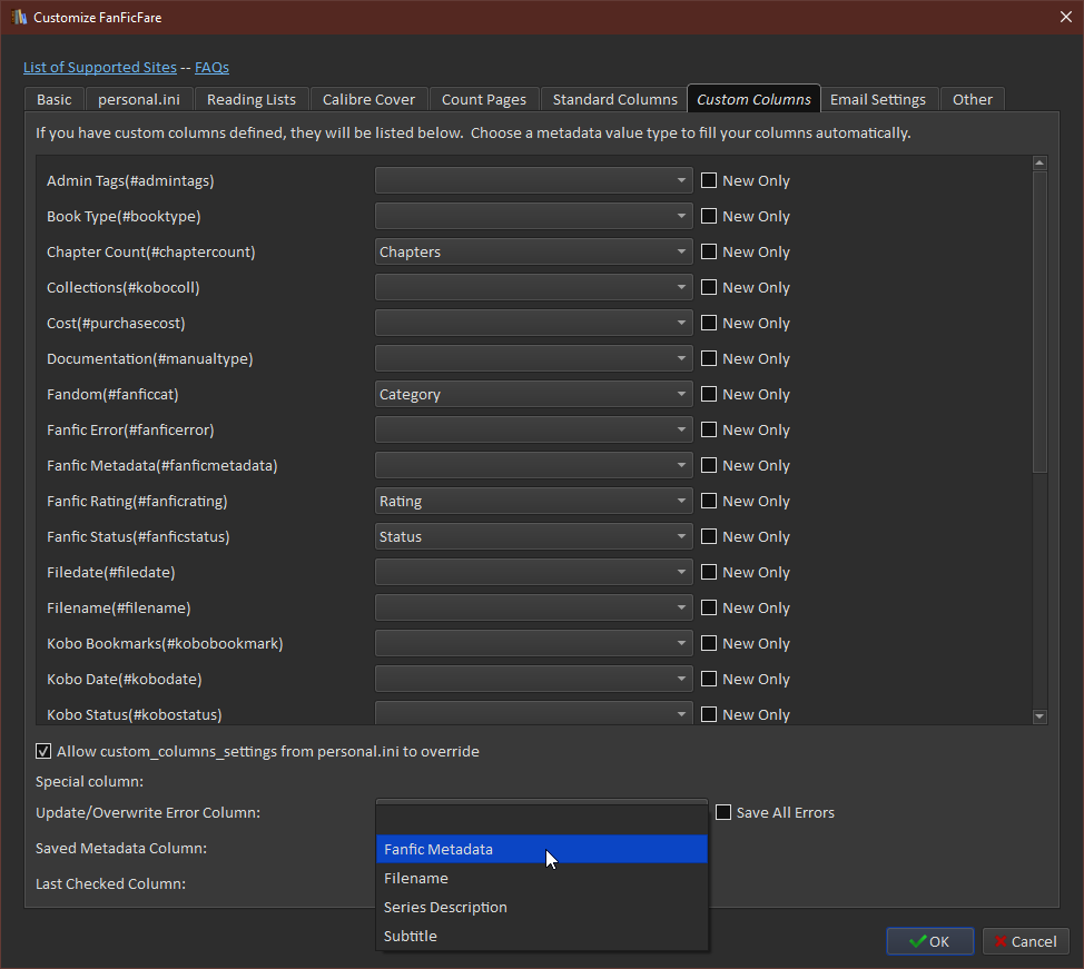 Okay I tried it and for the non-restricted stories my "Genre / Additional Tags" information is download and populates the "Saved Metadata" column. It did not work for any story that is restricted access. I tried asking Jim for help but he says it should work, that's why I was trying to find out from other people if it's actually working or not. Here is the story I tried: https://archiveofourown.org/works/34105225 |
