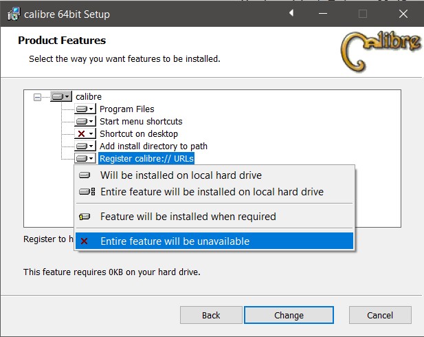 1. Why don't I see calibre in here? 2. What are the ramifications of a user choosing the Entire feature will be unavailable: for the Register calibre:// URLs installer setting - does it mean the copy links options in Book Details will be hidden or unavailable? 3. Also, what is the default setting for that installer option, I don't recall making a decision between the first 3 options. BR |