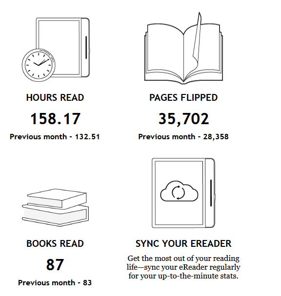 That said, I have two issues that are already making me think the hell with it. First, I wish Kobo were more transparent about what exactly counts. I assume it's purchased content direct-downloaded only, and that's fine. But what about books that are mostly or entirely read offline? Will Kobo count them when you sync? What about devices that don't sync entirely, which is a problem for a lot of people? Also, I prefer to read offline because of battery issues. And what I'm already finding extremely annoying is that syncing across devices isn't working all that well, i.e., sometimes it does, something nothing happens. I can work around it, but why should I be bothered? I have to say that Kindle is much better at syncing and at limited battery drain from being online. I'm in Camp Kobo overall, but that's the reality. I can't help thinking that part of the point of this contest (aside from generally encouraging people to buy from Kobo so their reading "counts") is more/better access to reading data. As I said, I don't object to Kobo's getting this, but I'm also not going to go out of my way to provide them with it. |