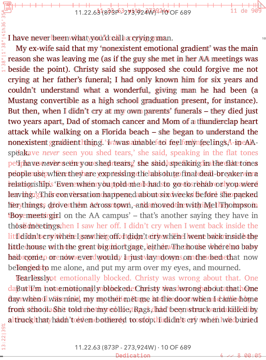 Kerning still worse, you see the first two sentences Hav e and m y wi fe. See the word leaving in the third line. And also KOReader fits more words per line. That's why after the first paragraphs the text is not the same in both screenshots. |