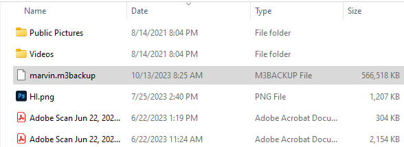 Just find your backup file - in this case it is a Marvin 3 backup - and copy it to your desktop: Change the extension from ".m3backup" to ".zip" Open the .zip file with your favorite software and go to the "Documents" folder. There are all your books! |