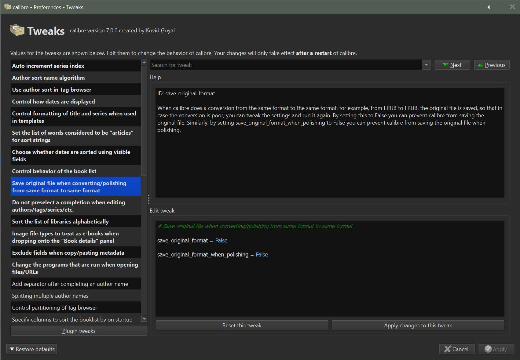 I can see that my method of converting epub to epub is probably not the best, I am only using it as a workaround to avoid having to deal with separate folders in calibre or externally. The tweak to disable the creation of .ORIGINAL_EPUB is tangential to that issue. I assume there's an intended reason for .ORIGINAL_EPUB to exist in the first place and therefore I would like to retain the file. I was thinking that, when .ORIGINAL_EPUB exists, it doesn't seem that it should be deleted. Since it is retained, I thought it was intended to be used as an archive. But as you have used it, it is more like a temporary file that enables you to "undo" a file modification. In any case, it should be more clear that when more than one epub to epub file modification conversion is done, the .ORIGINAL_EPUB will be used. The unclear gui prompt in the Conversion menu says EPUB -> EPUB, which mentions nothing about .ORIGINAL_EPUB. But, I don't know if that warrants any changes, since it's a niche problem with an unclear solution. Idk how archiving before conversion is meant to be done, but maybe it's not intended to be using .ORIGINAL_EPUB. I'd be happy with any way to save copy of original files whenever I do conversions. --- I haven't really looked into what epub to epub conversion is doing to the file, or that polish or modify existed. I'll definitely look into that! Last edited by arpeggioaccele; 11-20-2023 at 02:47 AM. |