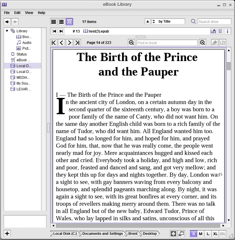 Stanza included this time for fun - hardly any formatting at all in Stanza, and no hyperlinking. Oh, one other thing I don't understand. Calibre is missing this line: "I — The Birth of the Prince and the Pauper" that all the other readers seem to pick up. Any ideas as to what we're seeing? -bjc |