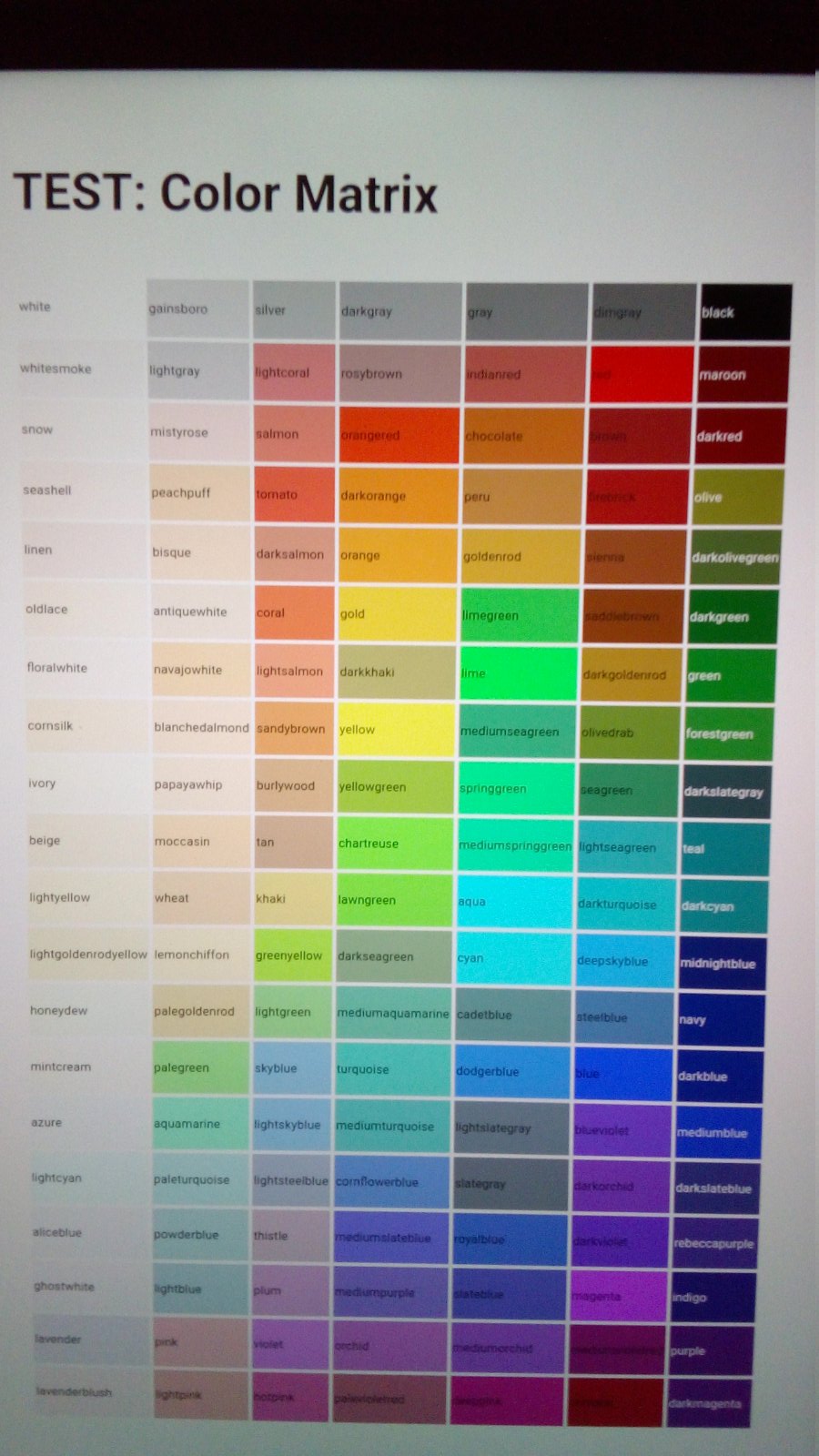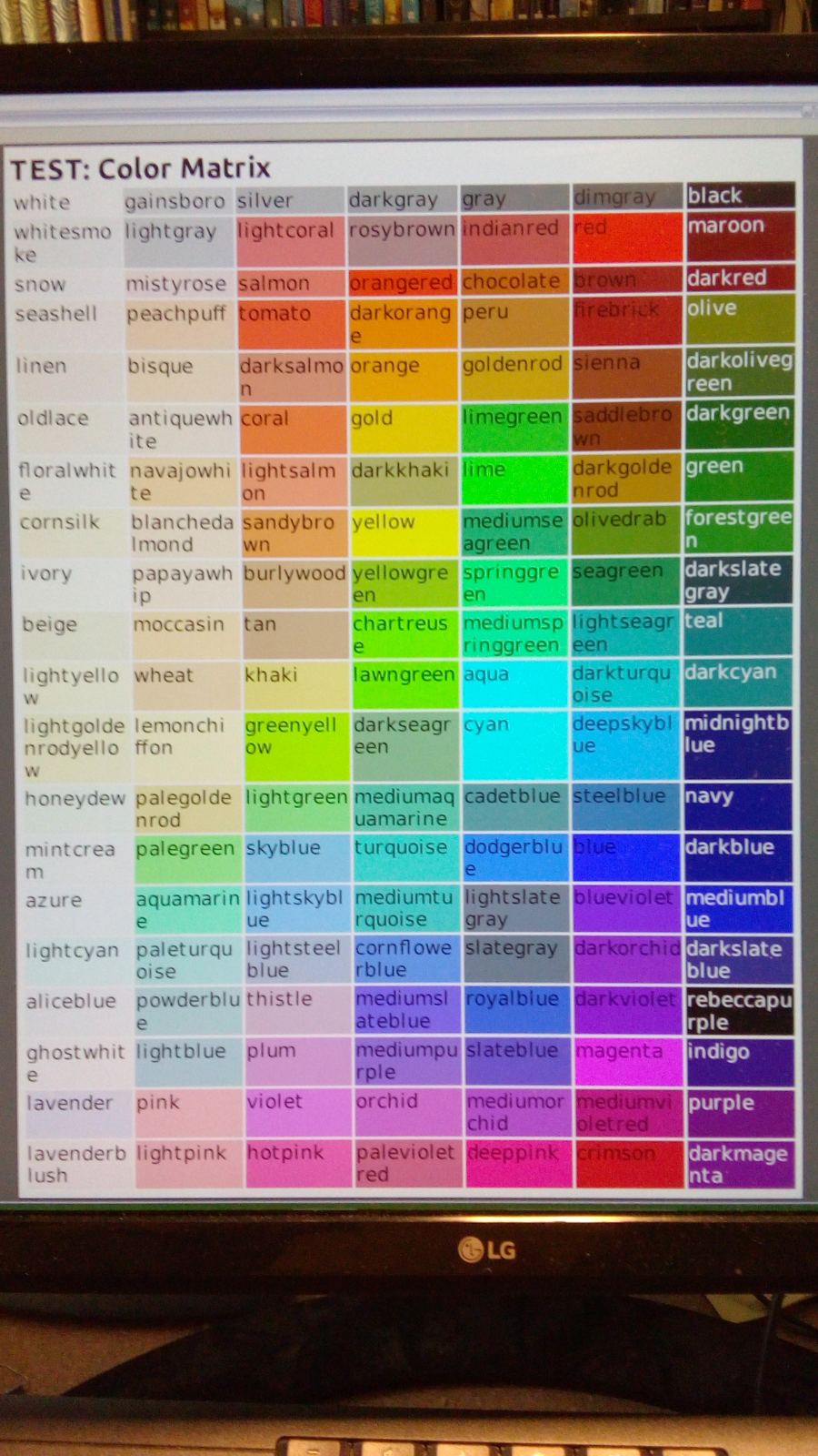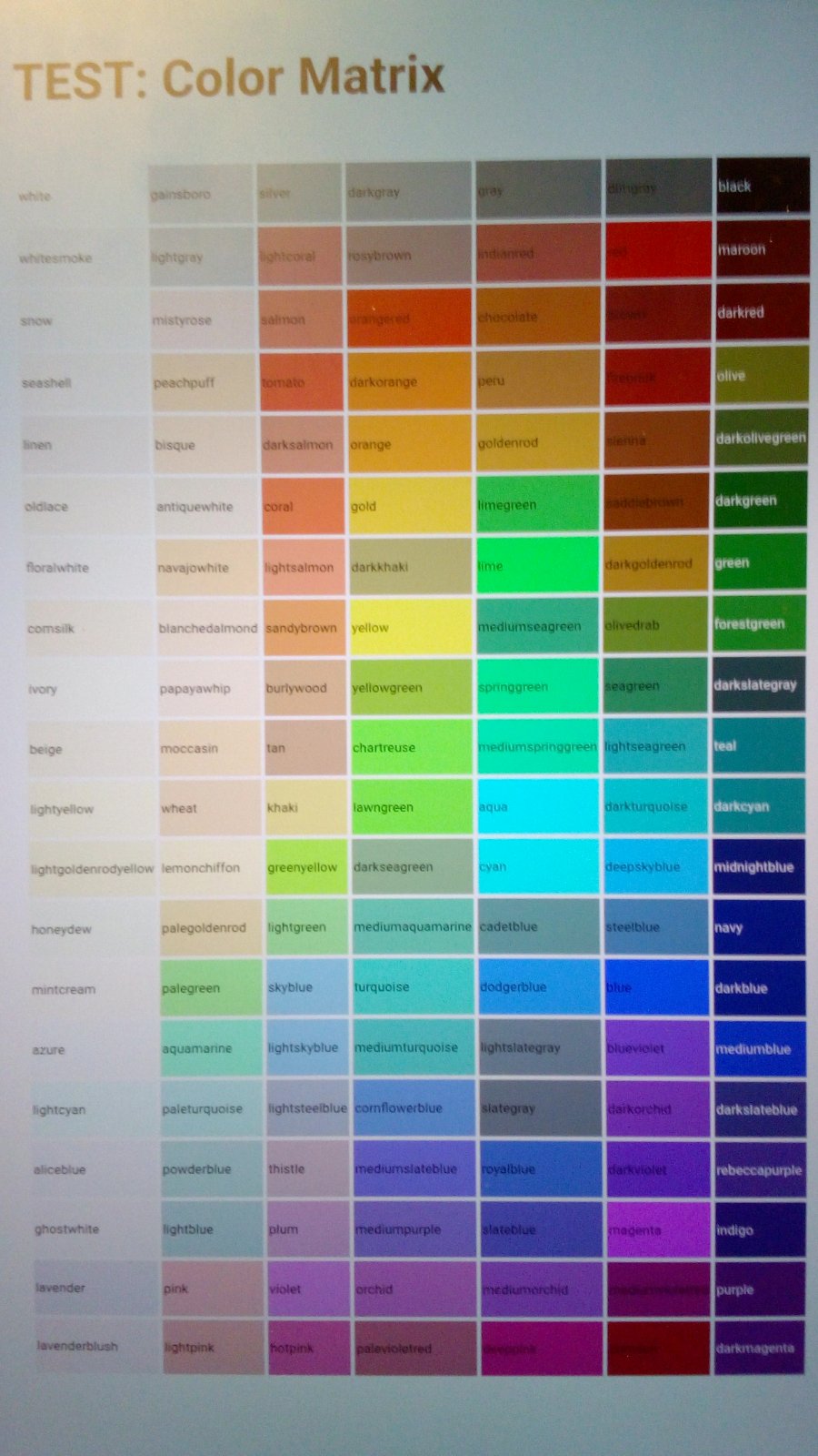 In short: The intention was to make "known" colors appear on the KLC and investigate how they looked on the real KLC display. That to choose the right blue color to make the document links stand out as they are hardly noticeable. (and you must encode them otherwise they are by default black, which was another finding) So I hacked a quick and dirty HTML-page to display several most used and known colors by their "official" names to make it reproducible. In real life I use color-codes and names where and when it suits me best. So my finding was that one of the "official" color names was not recognized by the KLC. And that goes for EPUB and KEPUB. My other finding is that the real rendering on the KLC screen is lacking distinction as most blue (darker) colors for instance look very the same. But that was expected (there is a reason why I choose actually the TLC Nxtpaper 11 for my colored documents )