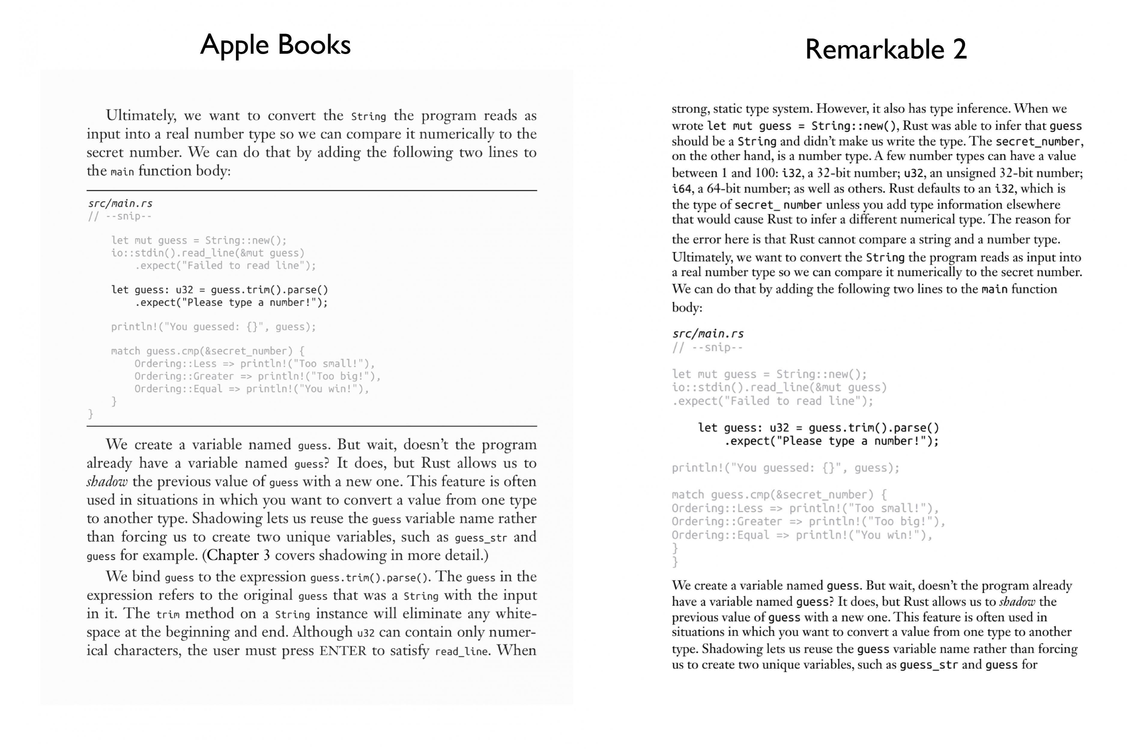 Remarkable will also read ePub format ebooks but the one time I played with the Remarkable 2 and ePub, it's CSS handling had very iffy. The owner was not certain if it was actually rendering the ePub or if it was converted to PDF at some point. I'm attaching two images from a Reddit post showing Books vs. Remarkable for ePub renderering. And yes, Remarkable seems to prefer left justified even when the CSS specifies text-align: justify.