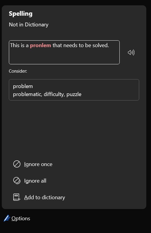 That said, I appreciate why the developers would be reluctant to change it, but I do wonder how many users make use of those hard coded shortcuts. If it were me I'd keep the context menu, but get rid of hard coded shortcuts except for Find in Text which I'd make Enter. And if it's doable, I'd make provision for a user assigned shortcuts in Preferences for Ignore and Add to user dictionary. But, I for one wouldn't assign anything to them… I'd use the AppMenu and arrow keys. BR |