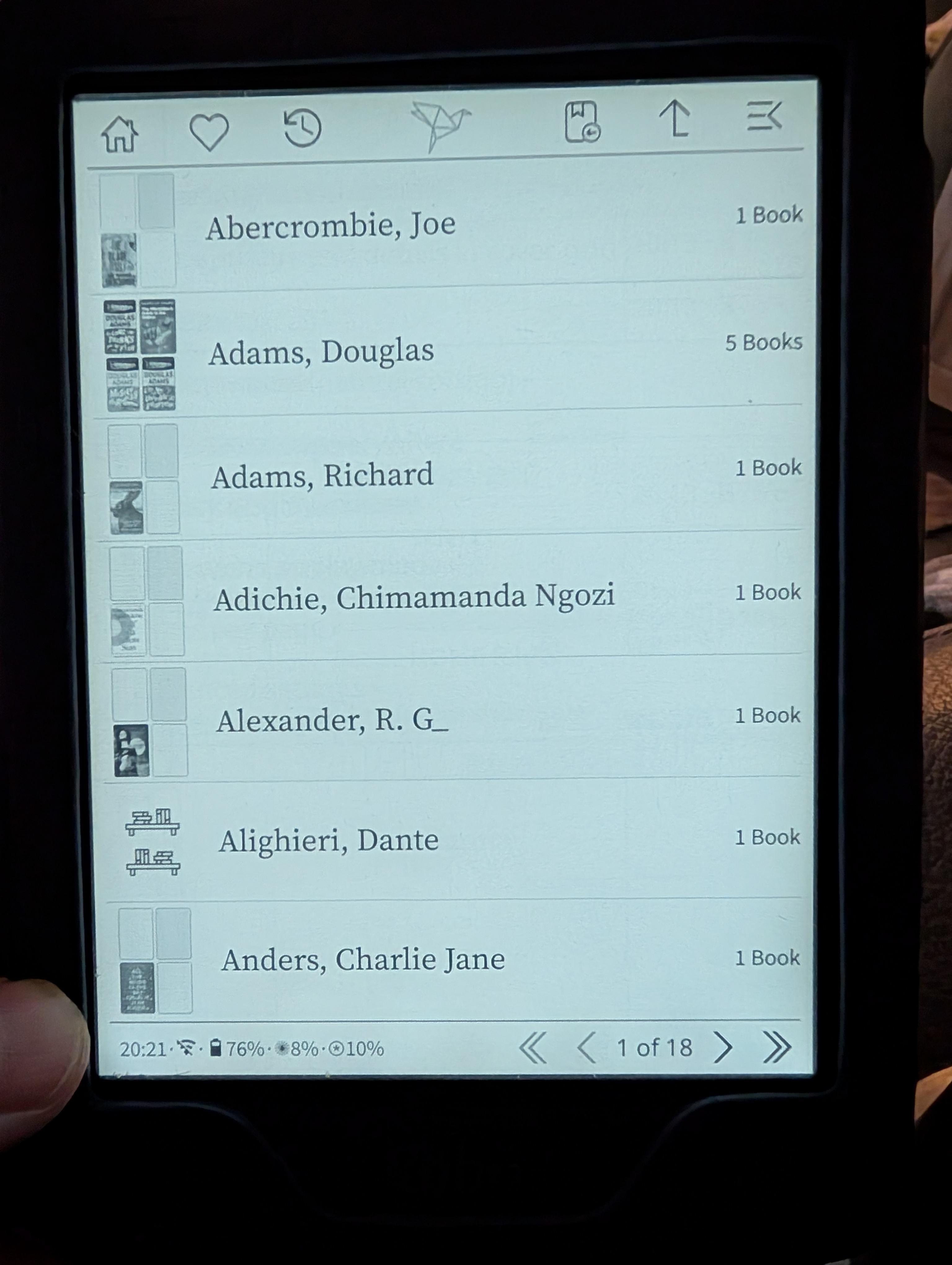 When I'm in any of the views that show cover art, authors for which I have multiple books show as a 4-tile panel of covers, as I expect. But for authors for which I only have one book in my library also show a 4-tile panel, one tile with the cover, and 3 blank tiles. From the screenshots I saw in the OP here, it looks like authors (or any folder I guess) which have only one book should show a larger single tile in the cover display panel. I'm running a Kobo Clara 2E with KOReader 2025.8, and downloaded the correct build of Project: Title. Install went smoothly, as described. After install I ran the extract and cache book info option as recommended. Attached screenshots of what I'm seeing. submitted this on GitHub as well. Really liking the changes this plugin makes, the file system forward home folder was pretty much the only 'downside' to me - great to see a better option! |