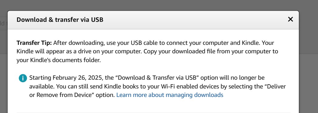 I wonder how slow their rollout of this will be. I just went in and did a download and transfer and had no such message. I'm in the US. I have 2 older devices still registered to my account...a K3 and a K4BNT (K5?)...along with an Oasis 3. Luckily I've been downloading all my Amazon books for years so I don't have to spend the next 2 weeks doing it.