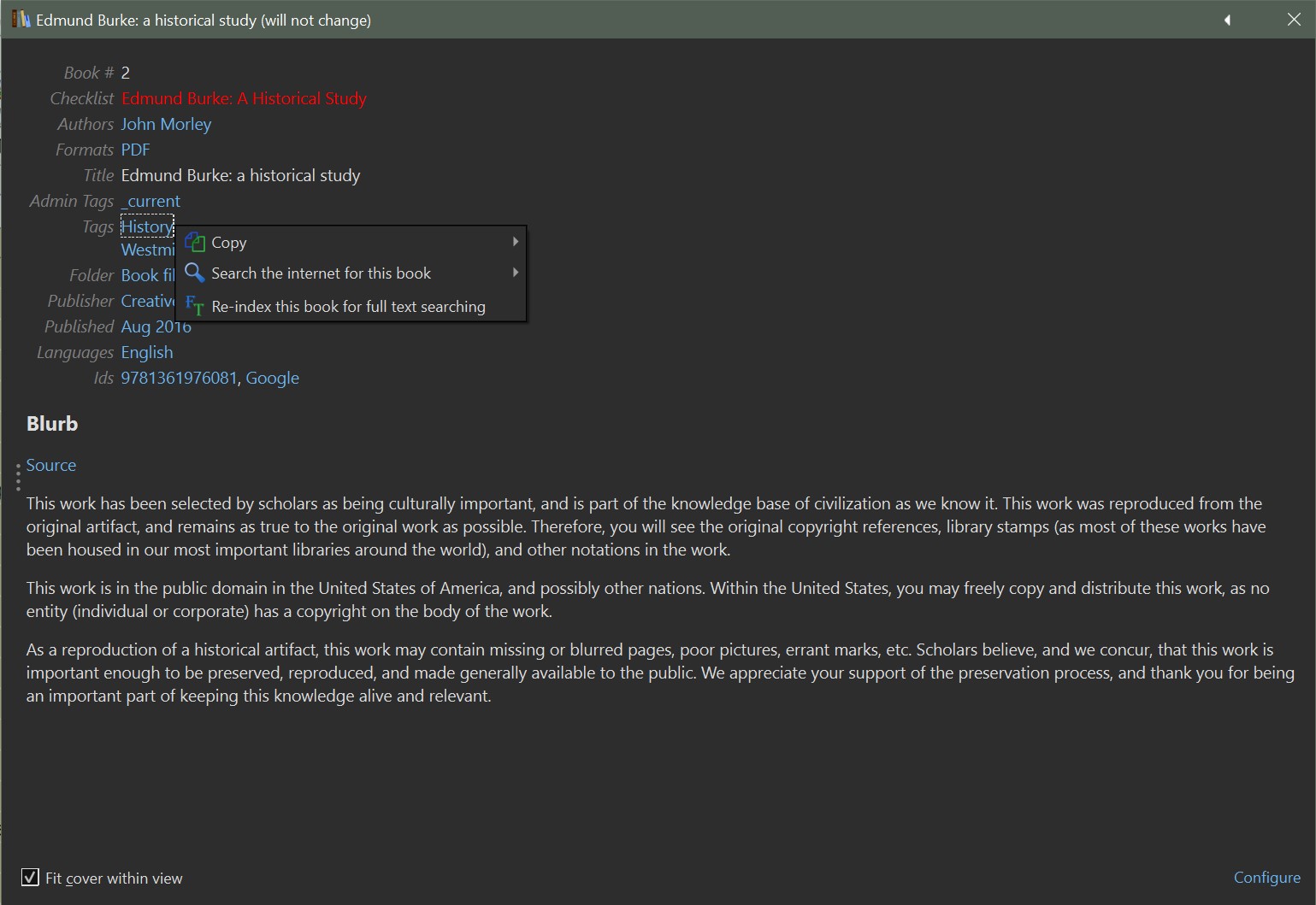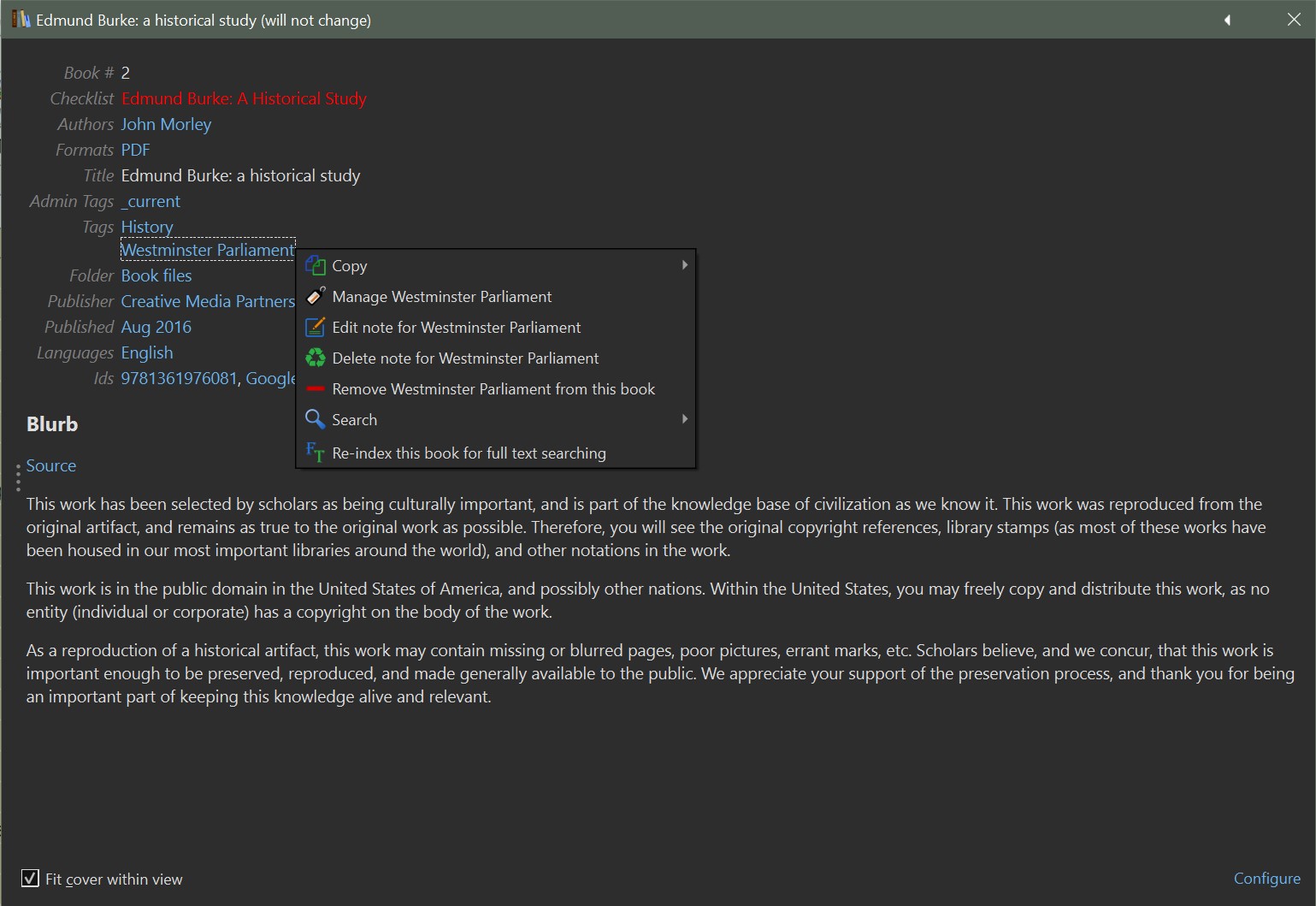 I booted into Safe mode Minimal, none of my tray gadgets started ✓ Started 8.2.1 portable with the Demo Library. The ≡ ley on Author, Tags, and Publisher in all 3 books popped the short (bad) menu… but the long (good) menu on Ids: Google. Booted into Normal mode - the ≡ key on Tags (History) in the two Morley books was showing the short (bad) menu, but on Tags (Classic) in the Tolstoy it was showing the long (good) menu. So I added a Tag (Westminster Parliament) to the Edmund Burke book, guess what - press the ≡ key on it shows the long (good) menu, but "History" continues to show the short (bad) menu. Here are the screen shots: And if I change a "History" Tag to "Political History" the ≡ key on it pops the long (good) menu. BR 😕 🤒