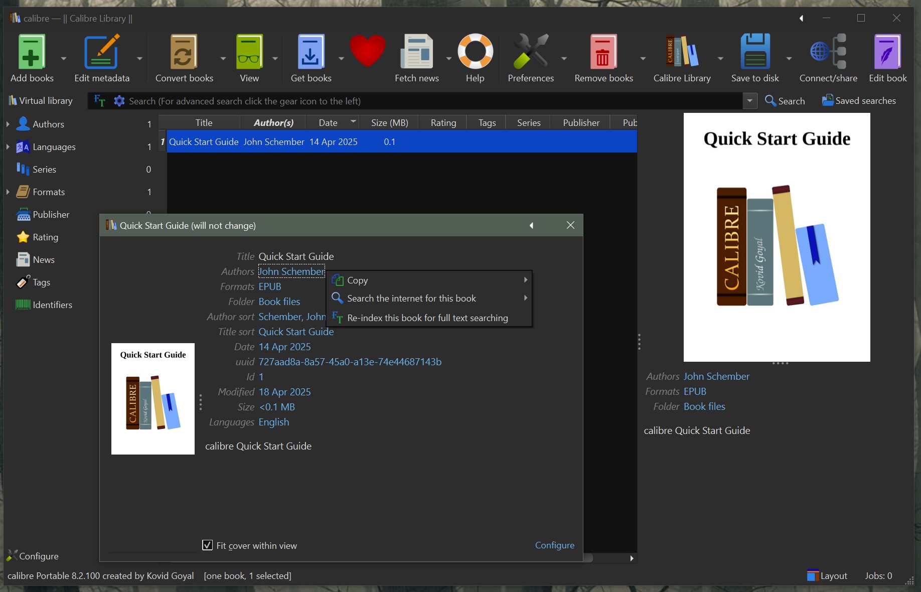 BTW: I installed portable 8.2.100 on a thumb drive. I've been able to plug it into it into 3 systems - not mine, none of which have ever seen calibre, one of which was a spanking brand new just delivered Surface Pro. All three show the wrong menu when I tab to John Schember in the Book details and press the ≡ key. I did not change any settings, or add any books - and it was a new freshly formatted thumb drive. The new Surface Pro had no add ons or any 3rd party software installed, so it was vanilla too. And Safe mode gave the same result. Given one my Kiwi collaborators can reproduce, maybe it is a latitudinal (or time zone) phenomena BR Last edited by BetterRed; 04-18-2025 at 02:15 AM. |