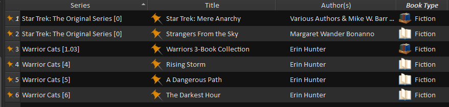 program: if '^omnibus$' inlist_field '#admintags' && $series_index !=#0 then series_start = floor($series_index); fraction = fractional_part($series_index); if fraction ==# 0 then result = series_start else series_end = floor(fraction*100); if series_end >=# 0 then result = series_start & '-' & series_end fi fi elif $series_index ==#0 then result = '' else result = $series_index fi; result I have just one book that uses 6.1 for 6-10 (Calibre removes the trailing 0.) Suggestions? I was thinking of splitting it as I have a few books from the series in physical format anyways. Last edited by ownedbycats; 06-13-2025 at 12:49 PM. |
