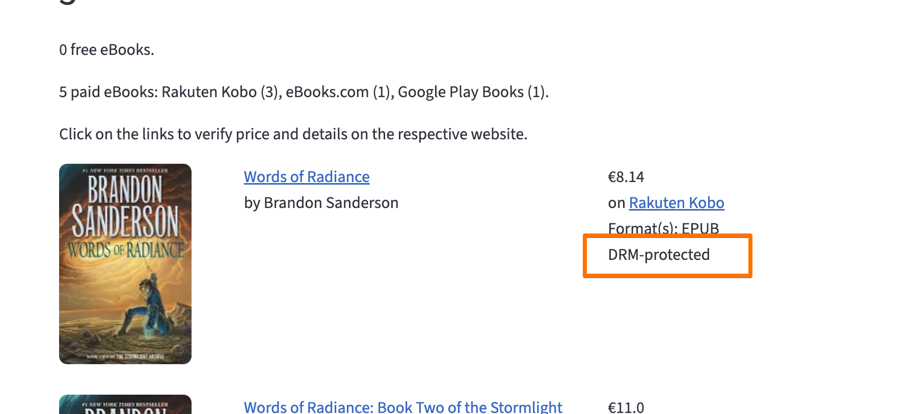 Searching for Sanderson / Words of Radiance, the two results found by the Kobo API are from Tor (DRM-free) and Gollancz/Orion (with DRM).