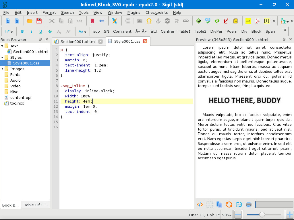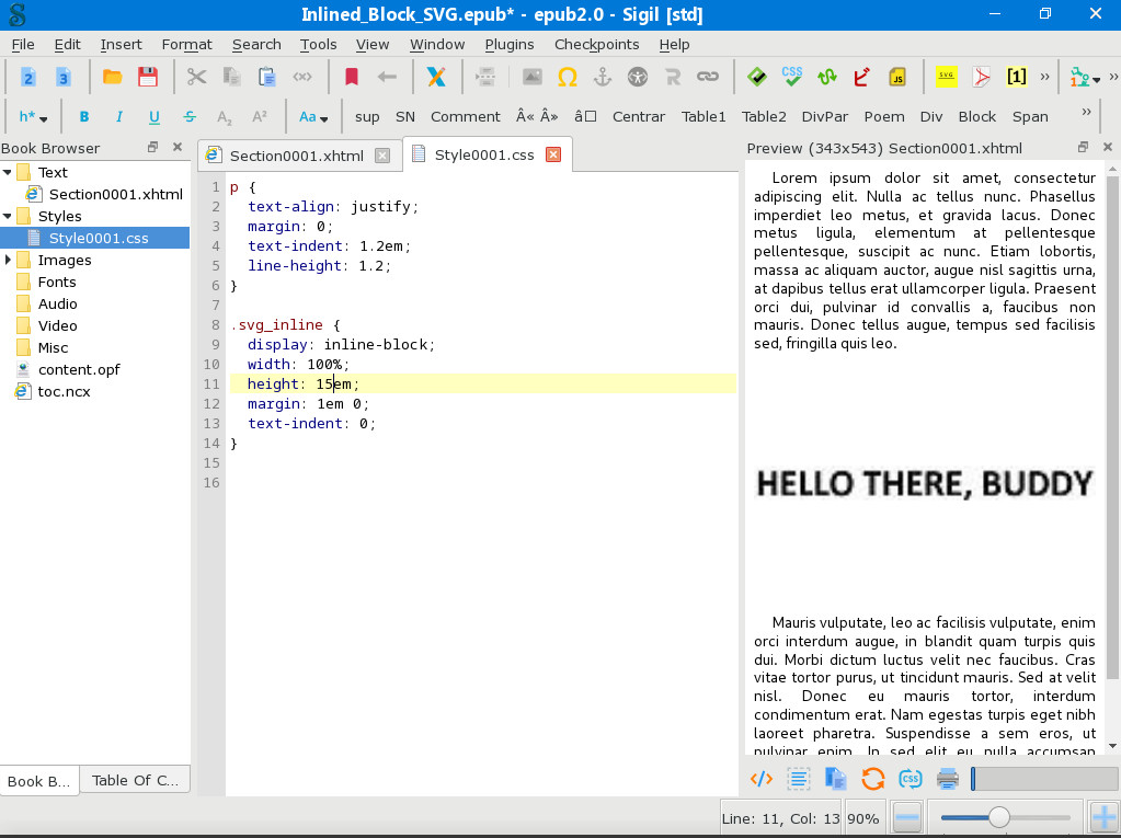 For the epub2, it doesn't honor a specific height (as the value there is set to "auto") making it ALWAYS 100% of the width of the window. (unless of course I change that value to Xem, in which case it runs the risk of the white space above and below if the screen is too narrow for the image) For the epub3 solution, it's a little funkier still... Changing the max-height value doesn't seem to have any effect at all—4em (as it is set in the original file) and 2em (as you said above) render the image exactly the same: always 100% of the width of the window, at a proportional height. Even more bizarrely, setting it to 1em results in the image's overlapping the paragraph below it. |