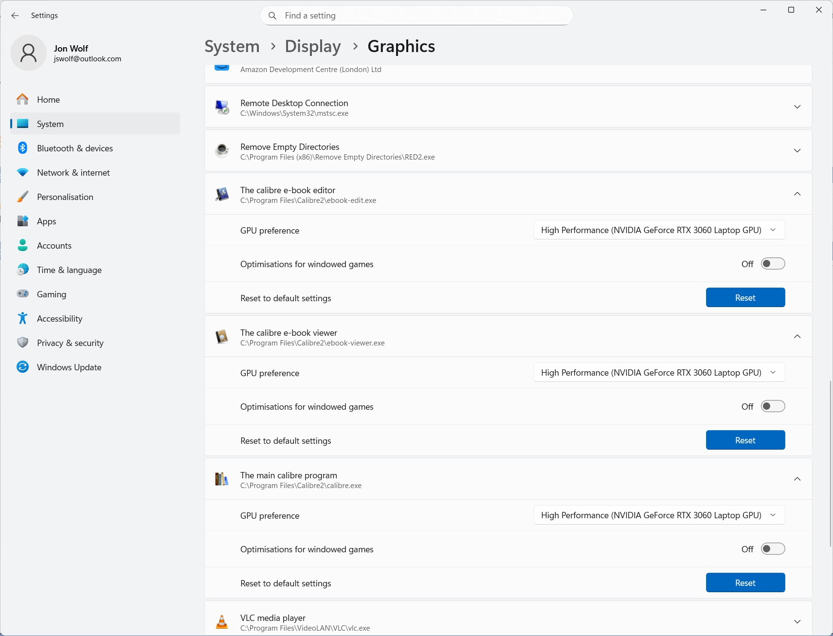 As for the dual video chipset, I don't know? No, I guess I am? I looked up how to tell, and I do have two things listed under Display adapters: Intel(R) UHD Graphics NVIDIA GeForce RTX 3060 Laptop GPU How do I know which Calibre is using? Quote: