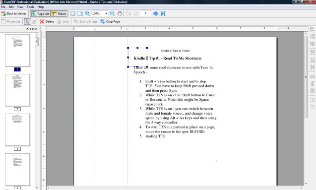 I copy and pasted the text into a Word Document. I set the page size to 4.5 inches by 5.75 inches. I added a header and page numbers (just because I could). I also used hard page breaks to get each tip on its own page (unless it was very short and then I'd put 2 on a page). The font was TimesNew Roman at 12pts. First I tried running the Word file the MPC but wasn't happy with the results, so I decided to use PDFRead after creating a PDF file with CutePDF Pro 3.6 (the free version) using the same page dimension (4.5 inches by 5.75 inches). I've been using this software for years but never explored all the features available even in the free version. The results were a pages sized to fit my Kindle but with a huge white border around it. I used the advanced crop tools to create a rectangle around the text on the first page that would be big enough to work for all pages in the PDF. Having that page number at the bottom of the page helped me to make the correct size rectangle. I now had a PDF with a very small border (there is a watermark at the bottom of the first page only which covers the page number - hey, for free what do you want). I ran that PDF through PDFRead and got a nice sized and very readable pdf. Edit: As I play more, it looks like this works best with PDFs you create yourself to fit a 6 inch screen. I'm not having much luck with PDFs created previously for 8.5 and 11 in pages (I'm still trying the script PDF in the first post to work). Last edited by daffy4u; 03-24-2009 at 10:53 PM. |