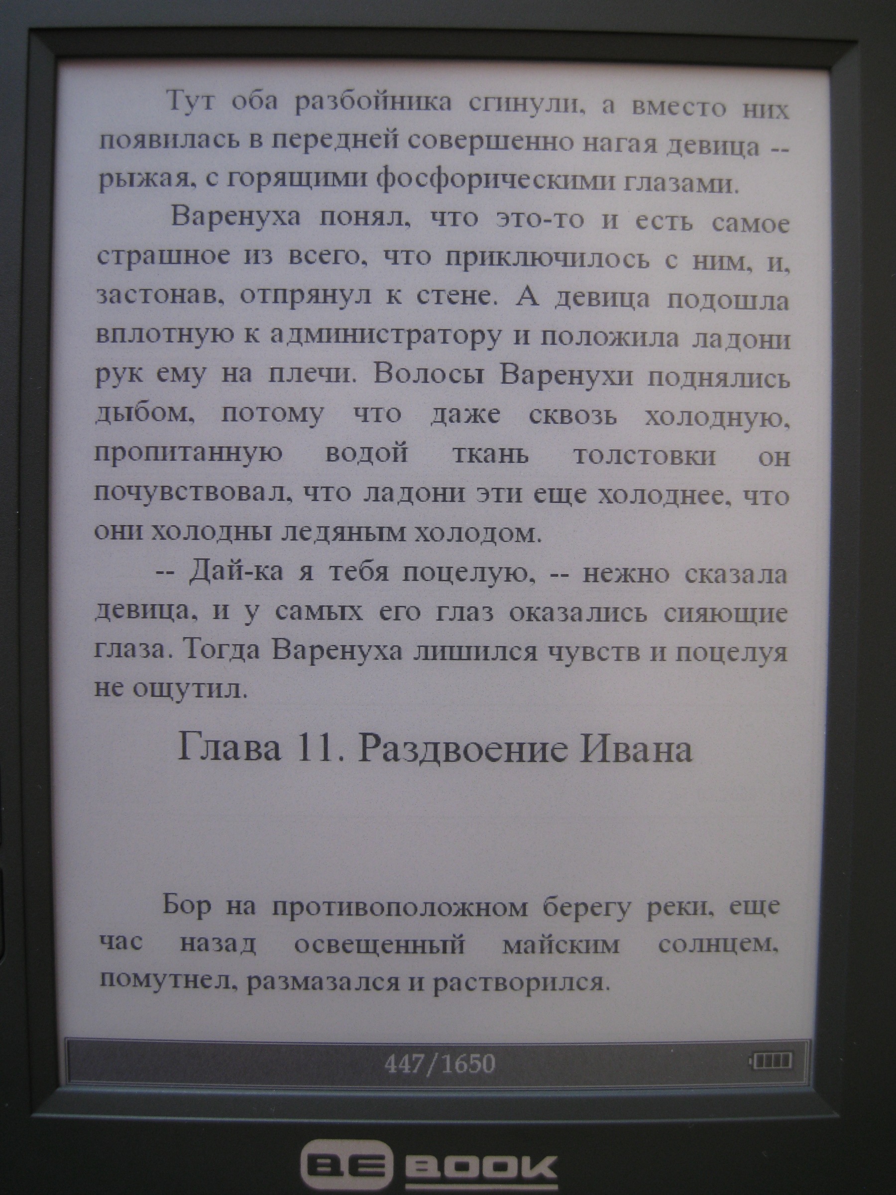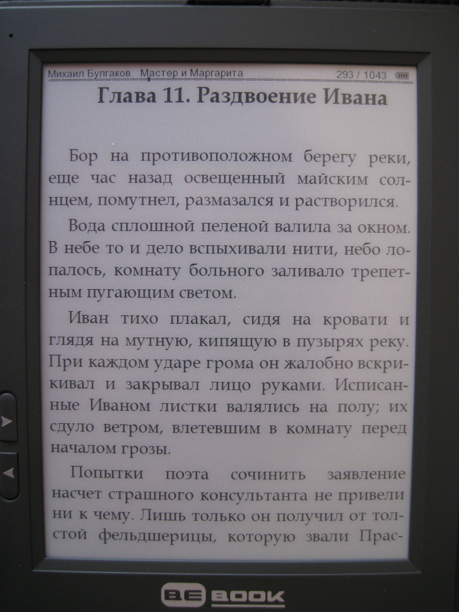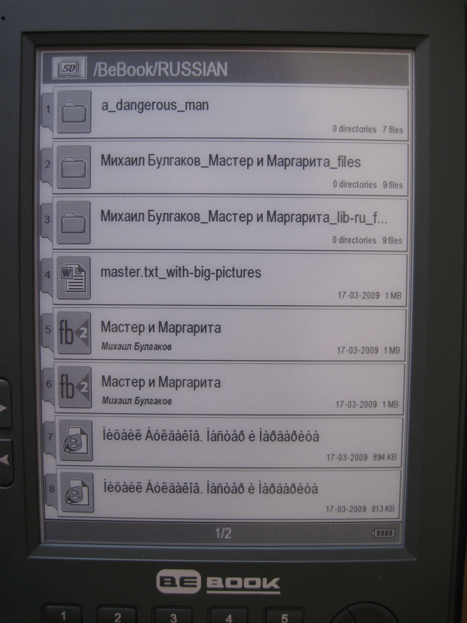 Allows user fonts to be loaded on the SD card in a fonts/ folder, so you can load various cyrillic fonts to choose from. Also the language settings allow you to set the device to Russian, so all menus/commands/screens are in Russian. And the BeBook supports FB2 which is popular for Russian eBooks, as well as a multitude of other formats (Mobi, Lit, Txt, Doc, HTML/CHM, PDF, etc.). If you have some docs you'd like tested on the BeBook, upload them and I can display them on my device and take some pics if you want to check out the Russian text. Cheers. |