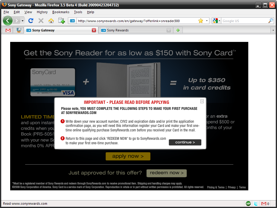 I was able to register for the SonyRewards registration page (using my Sony Card) approximately 60 hours after I was instantly approved for the Sony Card. Another person said it took them 4 days before they could register with their card. Just be patient, and once you can register, go ahead and order that silver* PRS-505! Make sure you don't have more than 50 rewards points before you order, as that would drop the price below $299 and disqualify you for $100 of the credit as well as the following $200 you can get for spending over $500 a month on the card. *(For the record, I want blue. But the offer only works for the silver reader.) Last edited by Zero9; 06-01-2009 at 02:55 PM. |