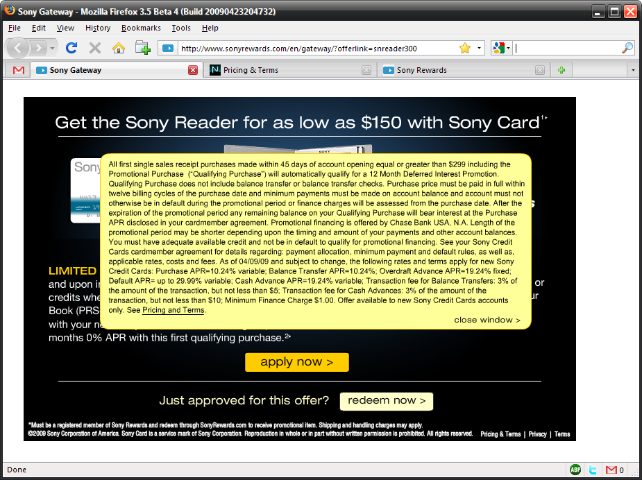 I called the card service center again, but they can do nothing at all. Even spoke to a supervisor. You must go through the email system, apparently. I attached a pdf of the main offer page, but I will certainly use yours when I likely get the brush off again. If I don't get my $50, I'll sell the reader at cost on Ebay and pay off the card and cancel it, out of principle. ![]() Is there any possibility I am supposed to get the $50 credit from Sony Rewards and not directly from Chase? Last edited by honkymagoo; 05-29-2009 at 09:25 AM. |
