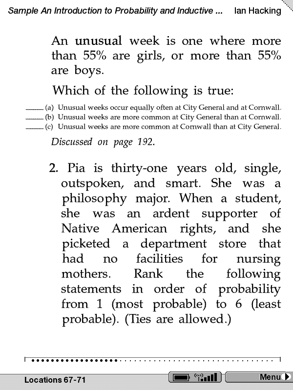 Screenshots of another TOPAZ ebook, An Introduction to Probability and Inductive Logic , for enarchay. These are again font sizes 3 and 4. The (a),(b),(c) lines are very small and don't rescale with the font change, because they are an image. It is possible to zoom images, but this does not help much here.