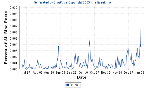 I just found a great tool to track trends at blogpulse.com. "E-book" buzz (ebook|ebooks|e-book|e-books) See attached thumbnail #1. It looks like the buzz created by the Sony Reader might have benefited the iRex Iliad as well. See attached thumbnail #2 Let's see how much the "buzz" picks up as the Sony Reader hits the market. Whether or not the buzz will translate into e-book market growth will remain to be seen... [OT] It looks like the Sony Reader announcement is the best think to come along for e ink in quite a while! See thumbnail #3. |