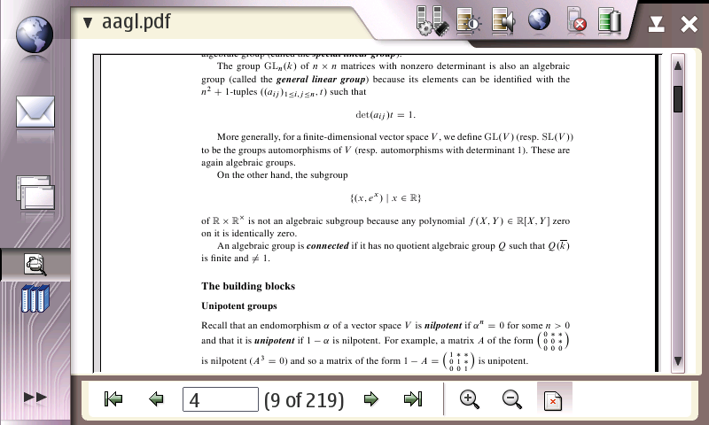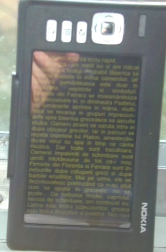 You can find all the applications available at maemo.org, specifically here www.maemo.org/maemowiki/ApplicationCatalog Another useful site is: http://nokia770.com/ For evince you need to download another package too and install it first (libgnomeprintui), and then the evince package, they are both available on the same site. There are many interesting applications at maemo.org and depending on my usage of the device I will check them out, right now since I use it only for reading those too (Fbreader and Evince) are good enough, but there are xterminals to access the "inner structure on the device", games, tools, graphics, office, lots of cool stuff and since it is Linux it is very easy to install In many ways I think that Nokia 770 is the opposite of Ebk1150 and presumably of the Eink readers which try to get close to print, this is pure LCD screen but amazingly beautiful. So reading on it is very different than on Ebk1150 or print for that matter, but I find it so compelling that I plan to rearead a lot of my favourite books that I have in e-form (of course time permitting ), and probably I will scan/ocr some that I would not have done otherwise just for the pleasure of reading them on this device. When I want to read traditionally I will do it either print or on Ebk1150.In terms of screen size, with the fonts described as above I get ~160 words per page, while on Ebk1150 I get ~100 words per page on large font (and the small one is just too small for me). And this is another reason that this device is great that even at smaller size (say in a full screen pdf page or 480x800 jpg image of a pdf page) the beautiful screen makes it readable with pleasure as opposed to Ebk1150 where I read with pleasure only in the large fonts. Since I budgeted 400$ for another ereader I will probably wait on the eink devices for a while though I will check them out. I probably could budget another 400 in several months but only if those readers will give me the same pleasure to read as this one (and even then the lack of backlight is annoying since I do most reading at night and I'd rather not use a booklight). I include a picture of the Nokia (unfortunately not as clear as the one of Ebk1150, the size is right but the actual picture is far brighter and clearer) for people to have a sense of how text shows on it. Liviu Quote: