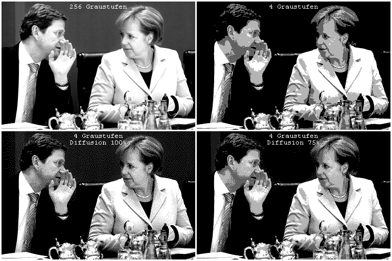 1. Im Hauptmenu (hier: PB301) sehe ich Schalter für 'Bücher' und 'Fotos'. Verstehe ich das richtig, dass ich im 'Bücher-Modus' keine Bilder betrachten kann? Will heißen, wenn ich zu einem Ordner navigiere, und in diesem sind Bücher _und_ Bilder gespeichert, ich die Bilder nicht anschauen kann? Muss ich dazu erst im Hauptmenu 'Bilder' anwählen? 2. In diesem Thread habe ich Screenshots von einer Spiegel-Seite auf dem PB360 gesehen. Wenn also ein PDF (mit Text und Bildern) geöffnet wird, werden sowohl Text als auch Bilder in 4 Graustufen dargestellt. Dabei sehen die Bilder natürlich etwas bescheiden aus. Und da bei mehr Graustufen die Darstellugsgeschwindigkeit und der Akku leidet, dachte ich mir, dass man die Qualität der Bilder mithilfe von 'Diffusion' steigern könnte. (siehe beigefügtes Beispielbild) Ist das einstellbar oder könnte die Darstellung dahingehend noch verbessert werden? MFG surrealufo |
