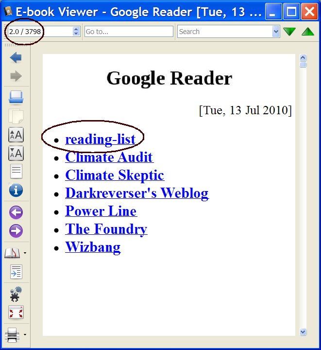Now the reason the two recipes should not be combined. The reason I used the Googlereader and not Googlereaderuber is because Googlereader recipe doesn't have the reading list. Read this post for details. The bottom line is because I have my subscriptions in folders this recipe (first post) now downloads all my articles twice and I end up with a book that has about twice as many pages as a result. Update: The attached images are the exact same articles downloaded today with the two different recipes. Even though the second has about 33% more pages the actual size wasn't much larger (7.9M vs 8.5M) so I guess I'm not locked into having two recipes. One recipe could be fine but if someone thinks they will be able to easily navigate through the mess that is the Reading List with "uncategorized" articles and all of the rest of the "categorized articles"... well it is practically useless. Of course until they learn how to place their feeds in folders at least they will be reaching their goal of grabbing articles using Google Reader.