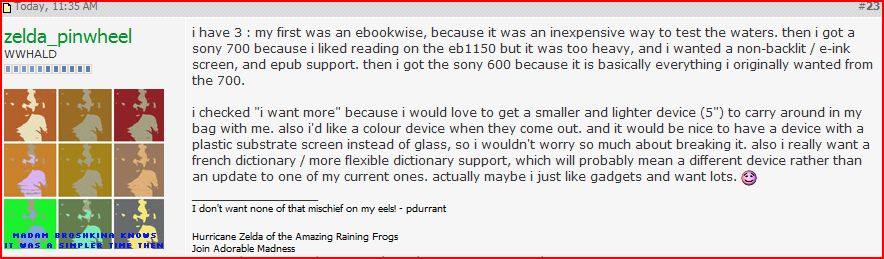 ![]() I can read just fine on my 5+ years old LCD dedicated readers like the B&W REB1100, 16-grayscale EBW1150 and MY favourite 32768-colour REB1200! The LCD PDA-type readers (Sony Clie's and iPod Touch) have screens that are just too small for me to enjoy the reading experience and I could never get used to (manually) switching pages so frequently... ![]() ( Perhaps if I could have used telepathy to change the page it would have made the difference! )My 16-grayscale 8" iLiad v2 is not really geared towards reading letter-sized .pdf ebooks, but that's what I use it for. It makes a good compromise between device size and screen clarity. As a novel reading device, it works just GREAT, but has no backlight! ![]() I'm still undecided what my next (colour!) reading device will be, but I think I have enough ebooks and capable ebook readers to wait it out a bit longer... I'm no stranger to using yesterday's technology as long as it WORKS!