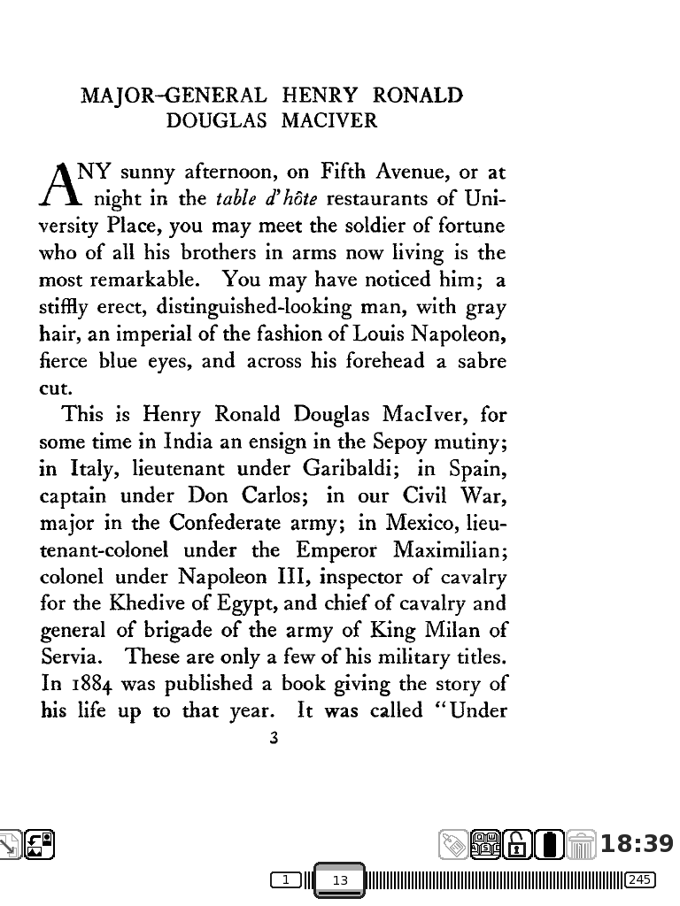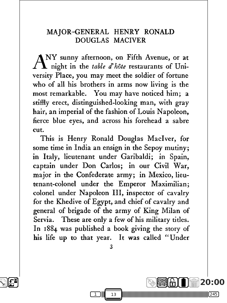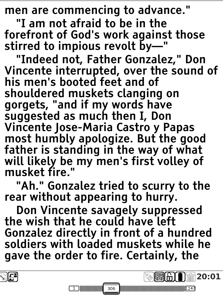 Source is here: http://www.sfires.net/fbshot/ (and attached) Compiled binary for iLiad is attached. To compile it with iRex's tool chain I use: arm-linux-gcc -O3 -o fbshot fbshot.c -lpng12 -lz -lm I've attached some screen shots I made showing off the new ipdf in action. horse.png and text.png are from Real Soldiers of Fortune as scanned by Paul. Text2.png comes from 1635: Cannon Law by Eric Flint and Andrew Dennis a Baen RTF file I converted to a PDF using Tiresias as the font. And yes, that's my clock bumping the PDF tools to the left (a bug I'm currently stomping on). |