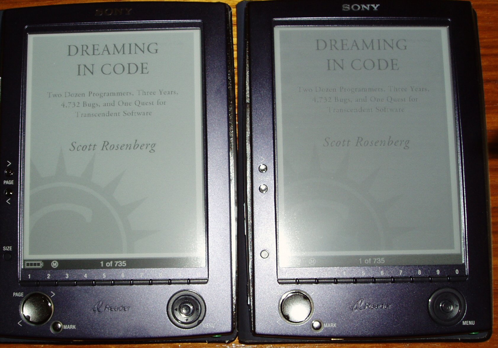 Right off I noticed a large difference in contrast between my two readers. In the past on the this forum I've seen people rave about how ink and paper like the lettering was in their books. I always thought, "well its nice" but its not _that_ nice. Well... With my original reader long reading sessions tired out my ol' eyes. And I needed perfect lighting to read without strain for long sessions. The new reader is night and day better. The blacks are inky black and the background appears to be a bit lighter as well, but the big difference is the true blackness of the "ink" in contrast to the dark grey on my orginal reader displays. On the new reader the lettering seems to almost float of the screen. If you look are the attached shot of the Reader menu you can see this across the very top. Thats not glare. The new reader, the left one, the top bar is darker then the reader housing itself. On my old reader the Reader housing (plastic) is darker then the black (more dark grey) ink. It is really noticable by looking at the right side where the numbered tabs are. Notice how dark the curser/pointer is on tab 2 as well as the contrast forming the 3-Dness of the tabs. The Icons on the left are clearly darker as well. The second attachment shows the noticable difference in greys and black in a cover shot of a book. (Dreaming In Code) The first shot was taken with "natural light" from the bottom of the shot. The second shot was taken with a flash, which I tried to center between the two readers. Now that I have two readers(!!) I'll give Sony a call on Monday and see if I can get the first one repaired. So far they've been very good to me. Last edited by CoryDog; 08-18-2007 at 03:55 PM. |