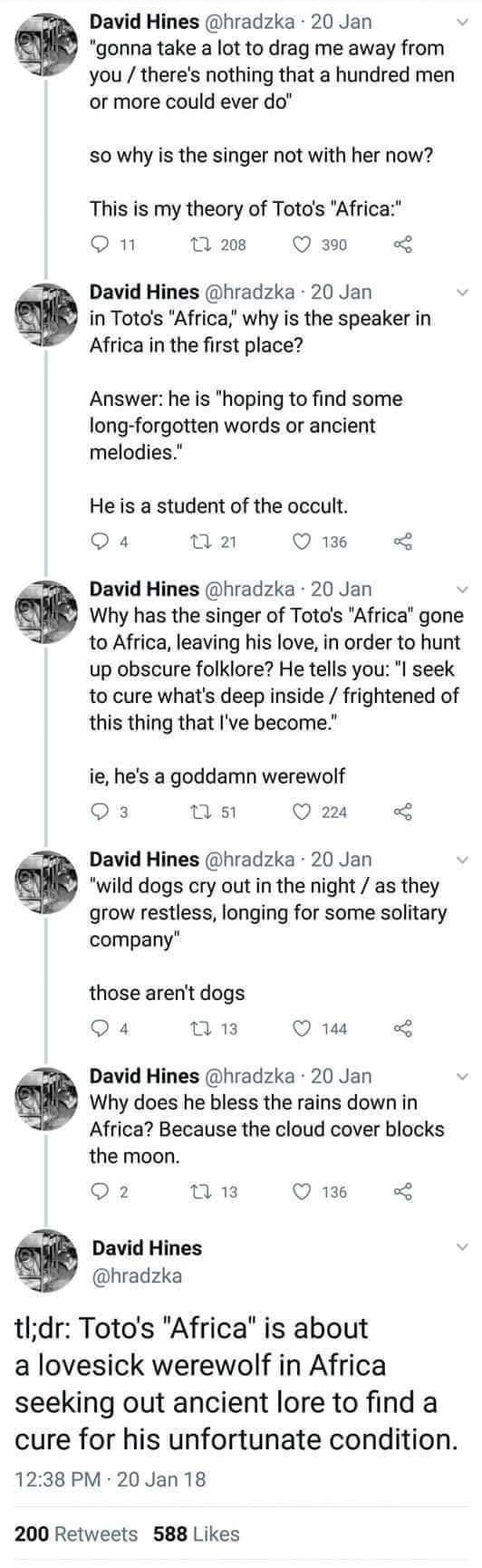 Well, I began thinking about it, and we know that vampires are supposed to be hurt by holy water. I wondered if priests could say prayers over every storm cloud and kill the vampires. I realized it must be possible, because there really weren’t any reports of them in Africa. Why must it work, you ask? Well, someone already blessed the rains down in Africa. |