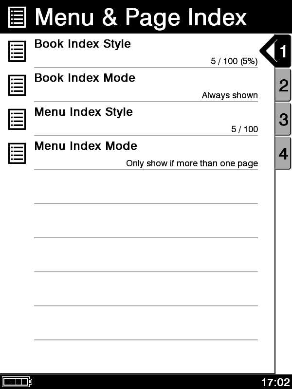 during the holidays I thought of some more helpful page index modes (page left, page left %), so I added them. I also included a setting for the menu index and renamed the section to "Menu & Page Index". Great job on the release candidate, everything seems to be working great so far. The only exception is, that the up and down keys in the included Mahjong game don't seem to work correctly while selecting tiles. Instead of up/down they move the cursor two tiles to the left/right. It is very nice to see your continued work on this, thank you very much Duglum |